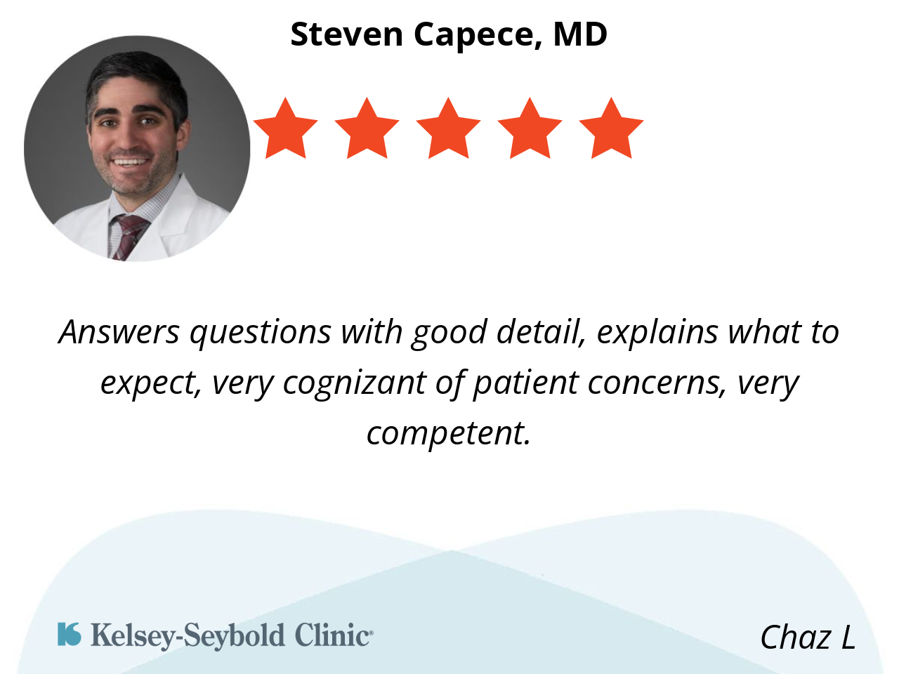 Answers questions with good detail, explains what to expect, very cognizant of patient concerns, very competent.