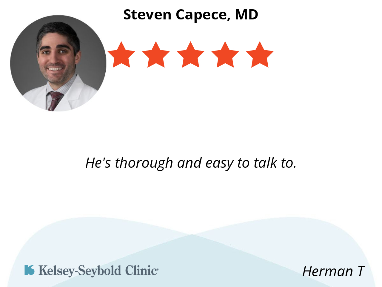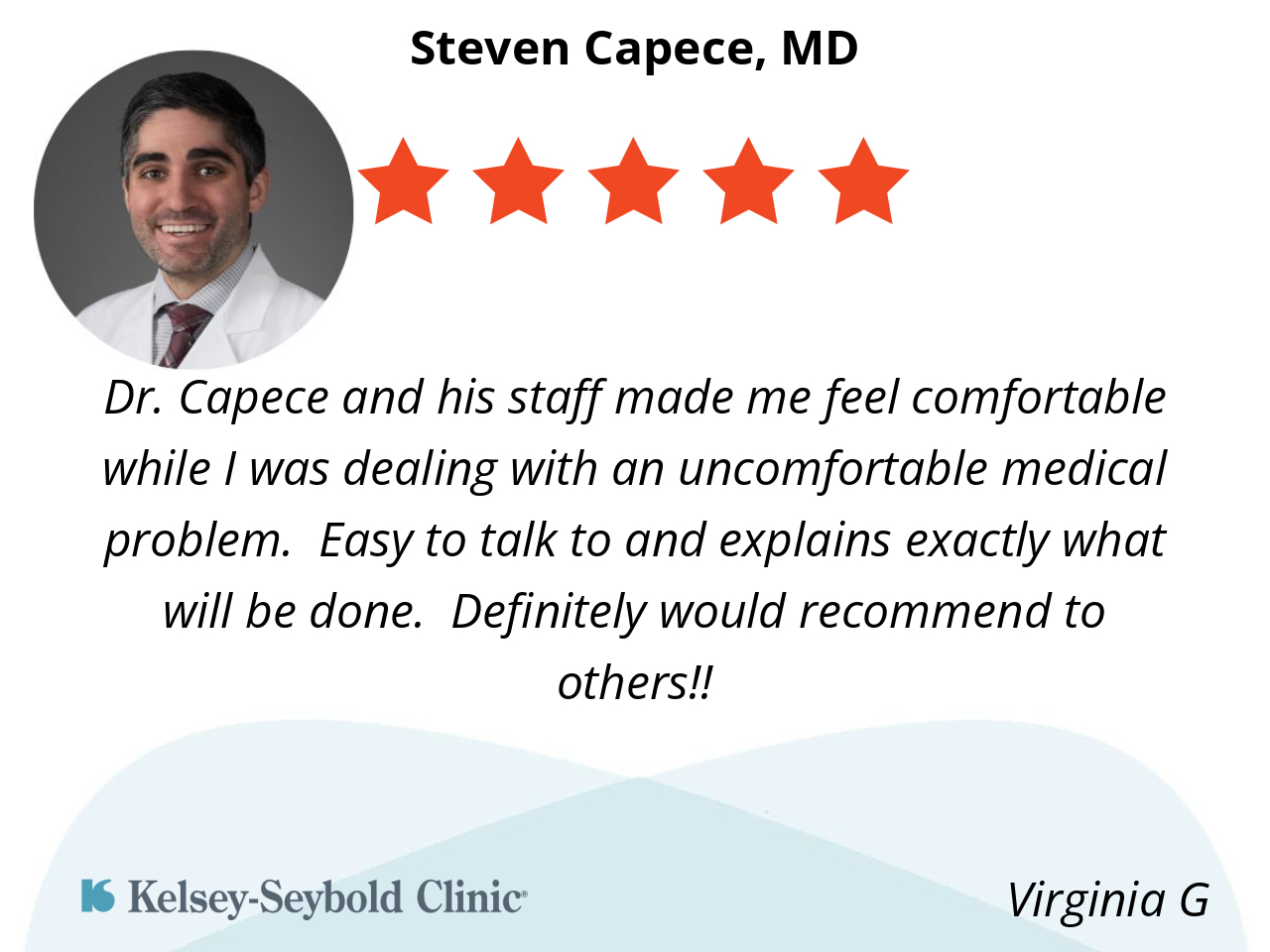Dr. Capece and his staff made me feel comfortable while I was dealing with an uncomfortable medical problem. Easy to talk to and explains exactly what will be done. Definitely would recommend to others!!