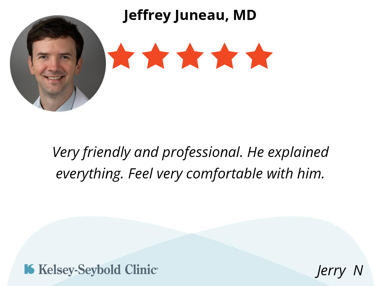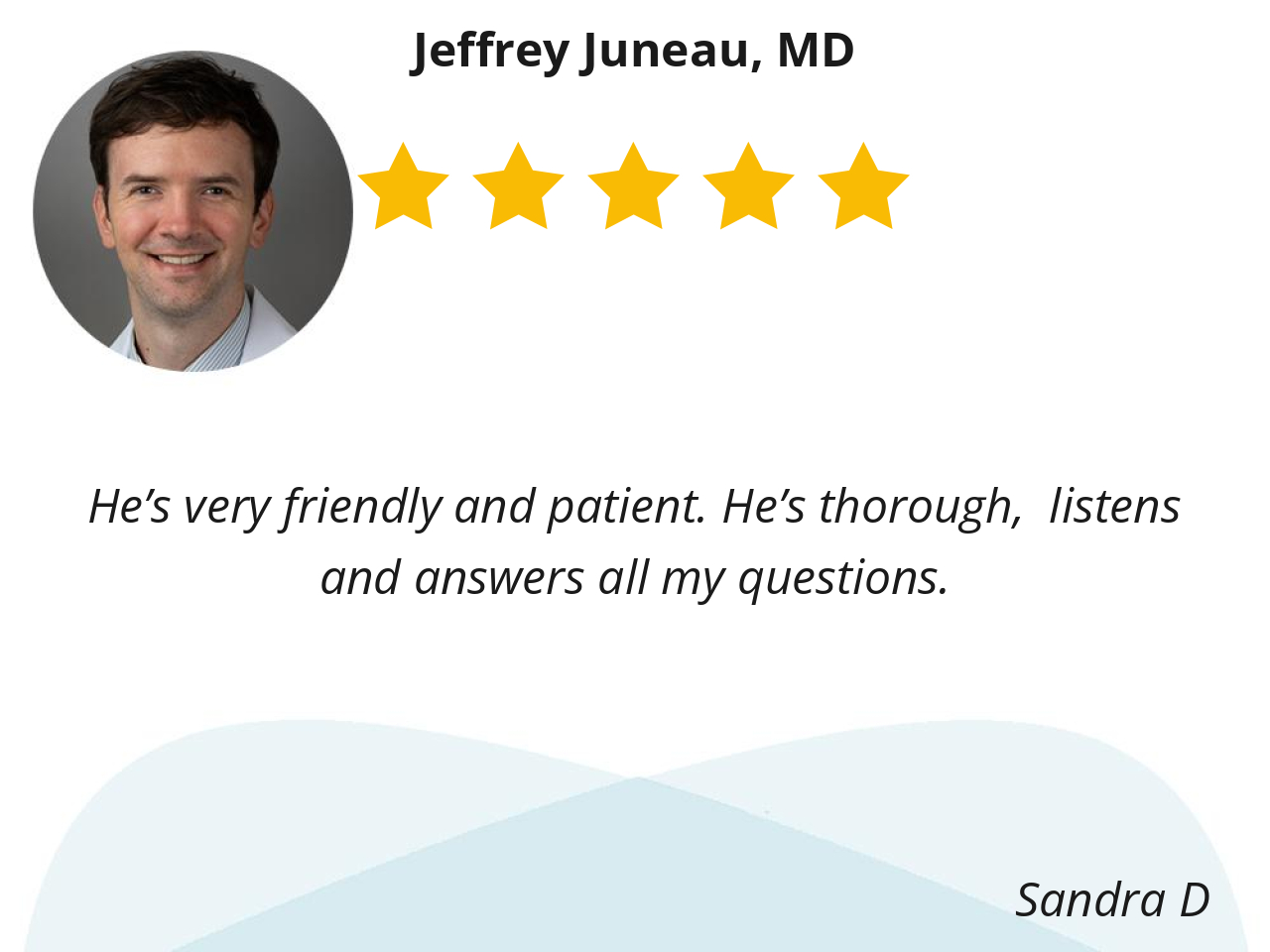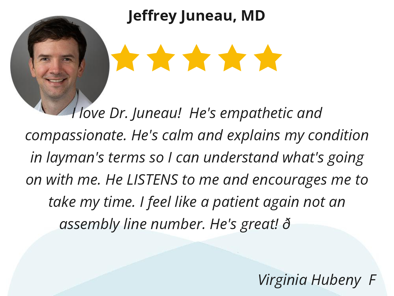 I love Dr. Juneau! He's empathetic and compassionate. He's calm and explains my condition in layman's terms so I can understand what's going on with me. He LISTENS to me and encourages me to take my time. I feel like a patient again not an assembly line number. He's great! 👍❤️