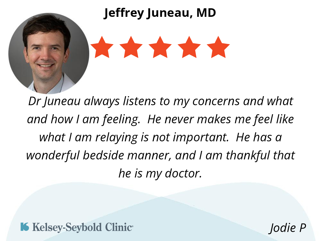 Dr Juneau always listens to my concerns and what and how I am feeling. He never makes me feel like what I am relaying is not important. He has a wonderful bedside manner, and I am thankful that he is my doctor.