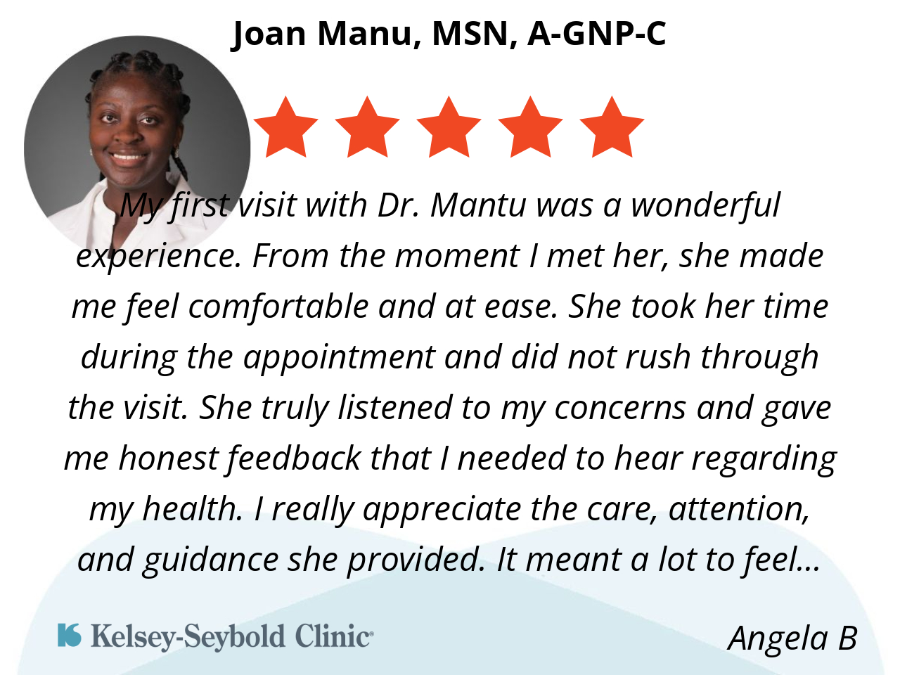 My first visit with Dr. Mantu was a wonderful experience. From the moment I met her, she made me feel comfortable and at ease. She took her time during the appointment and did not rush through the visit. She truly listened to my concerns and gave me honest feedback that I needed to hear regarding my health. I really appreciate the care, attention, and guidance she provided. It meant a lot to feel heard and supported. I look forward to continuing my care with her and working on improving my overall health.”