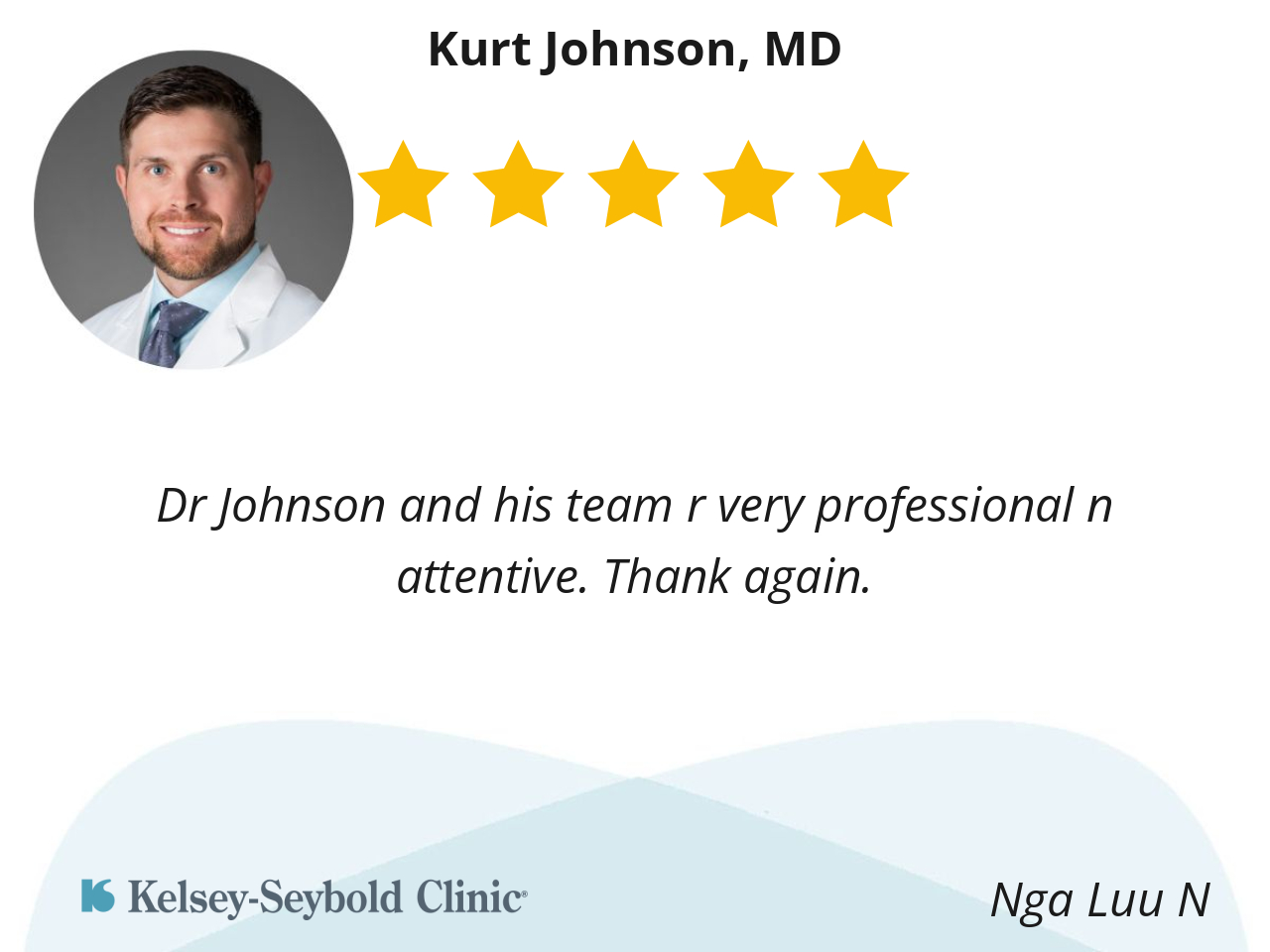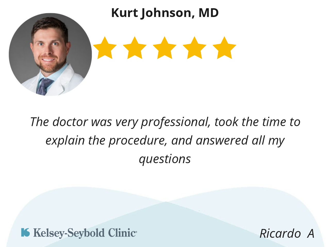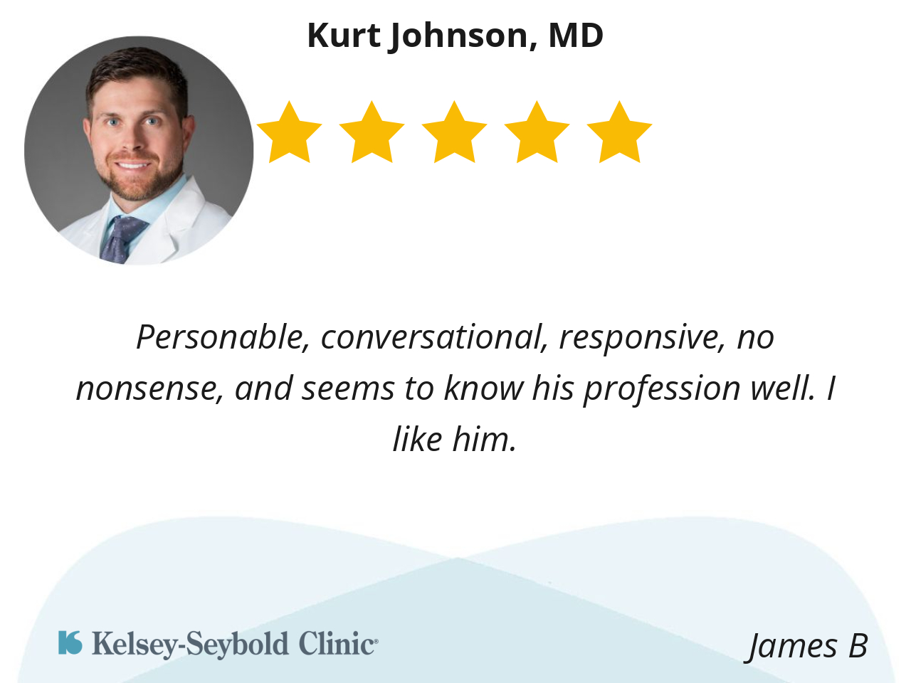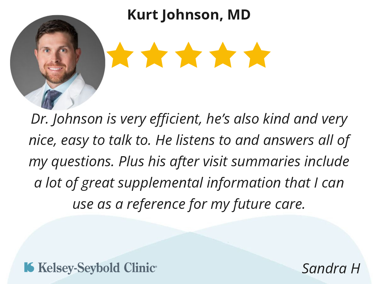 Dr. Johnson is very efficient, he’s also kind and very nice, easy to talk to. He listens to and answers all of my questions. Plus his after visit summaries include a lot of great supplemental information that I can use as a reference for my future care.