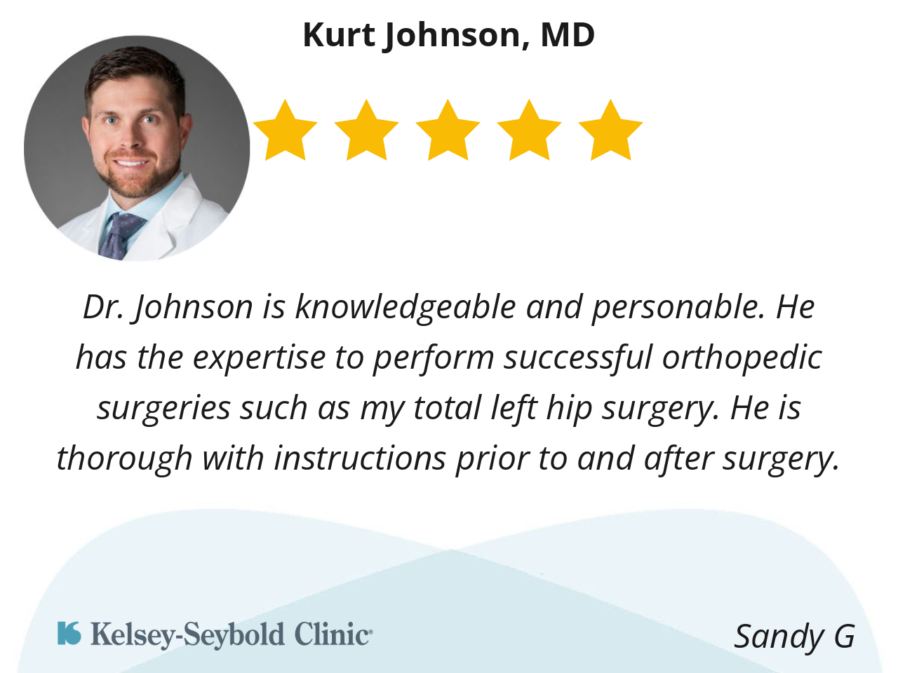 Dr. Johnson is knowledgeable and personable. He has the expertise to perform successful orthopedic surgeries such as my total left hip surgery. He is thorough with instructions prior to and after surgery.