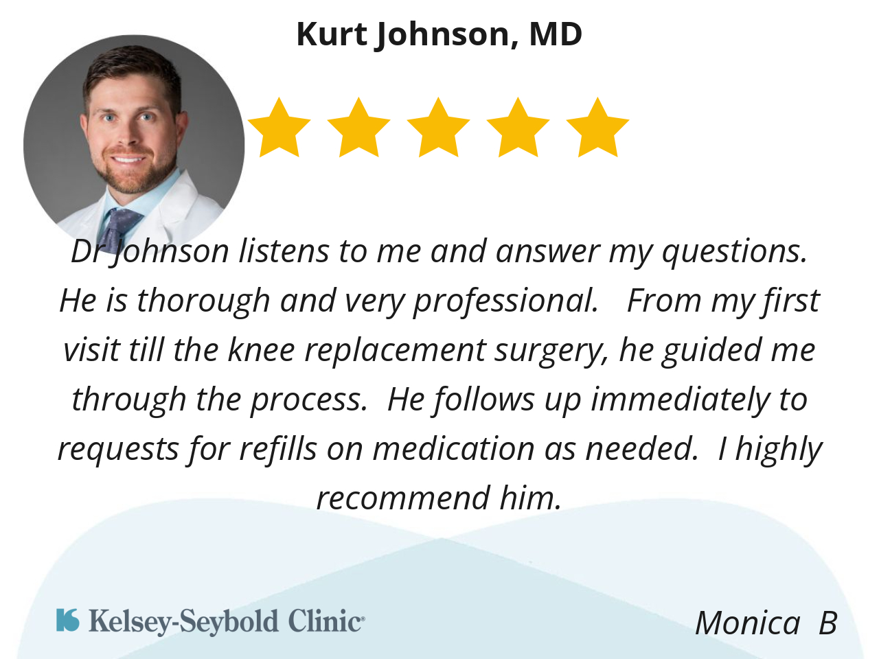 He performed hip replacement surgery in my husband and it has been successful! Dr. Johnson is doing a knee replacement surgery for me .