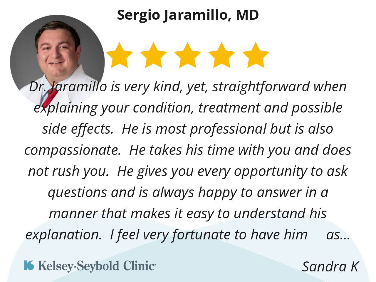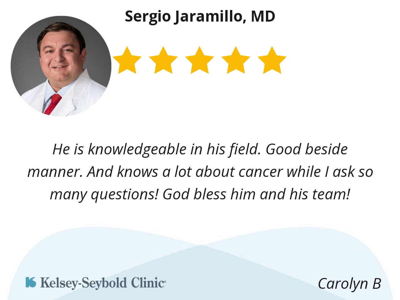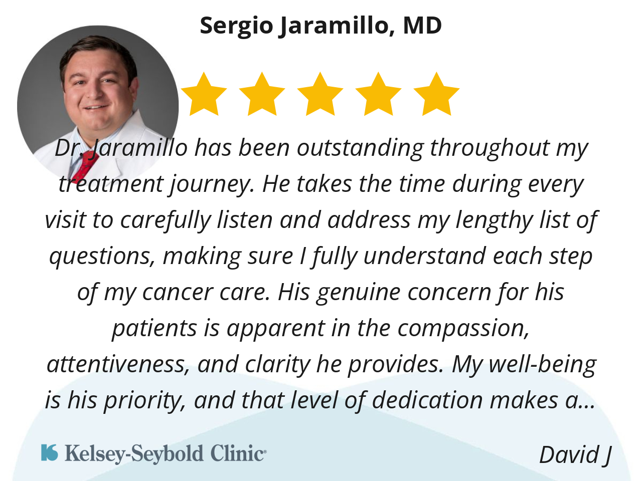 Dr. Jaramillo has been outstanding throughout my treatment journey. He takes the time during every visit to carefully listen and address my lengthy list of questions, making sure I fully understand each step of my cancer care. His genuine concern for his patients is apparent in the compassion, attentiveness, and clarity he provides. My well-being is his priority, and that level of dedication makes a complex process much easier to face.