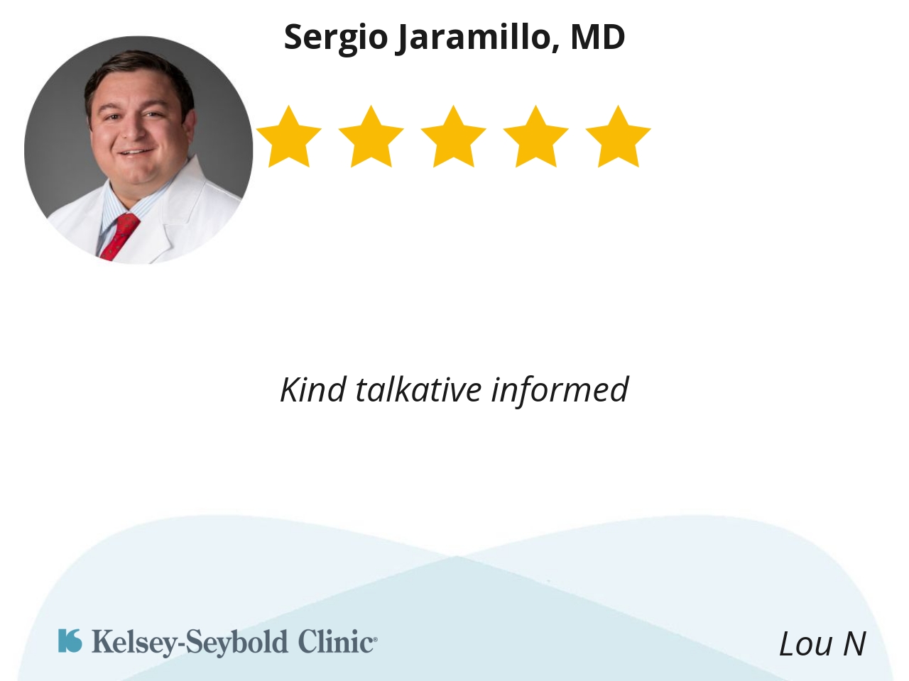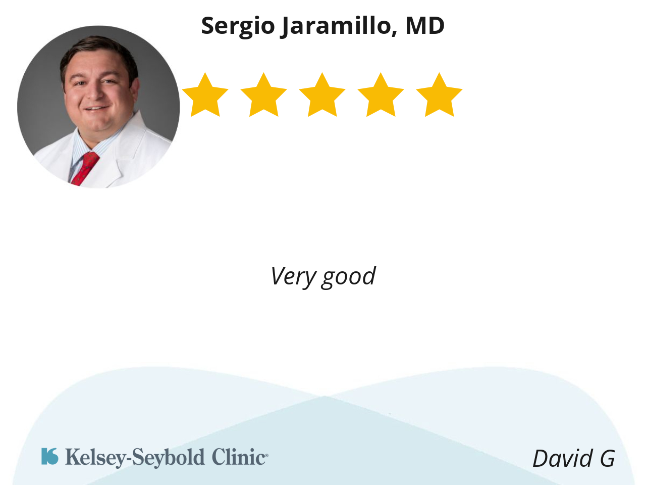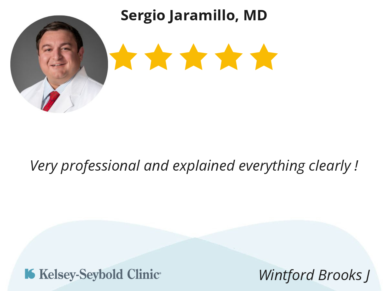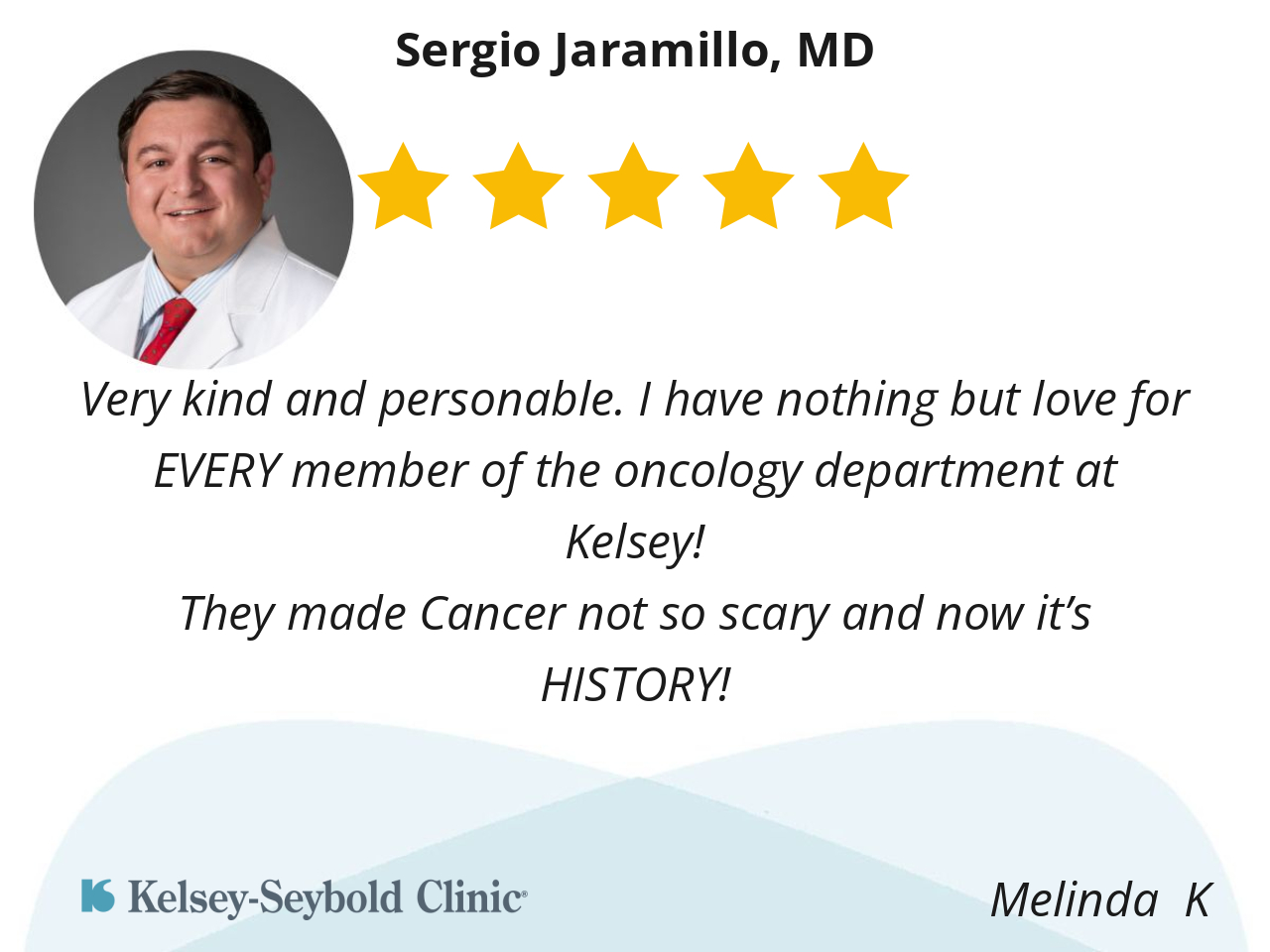 Dr. Jaramillo has been outstanding throughout my treatment journey. He takes the time during every visit to carefully listen and address my lengthy list of questions, making sure I fully understand each step of my cancer care. His genuine concern for his patients is apparent in the compassion, attentiveness, and clarity he provides. My well-being is his priority, and that level of dedication makes a complex process much easier to face.