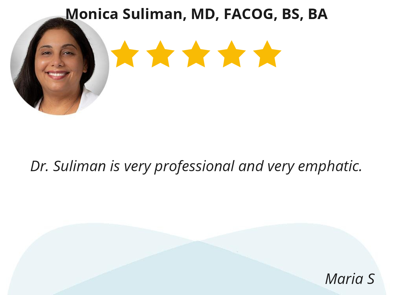Dr. Monica Suliman was really nice and knowledgeable, she answered all my questions and made sure I was comfortable during my well woman's visit.