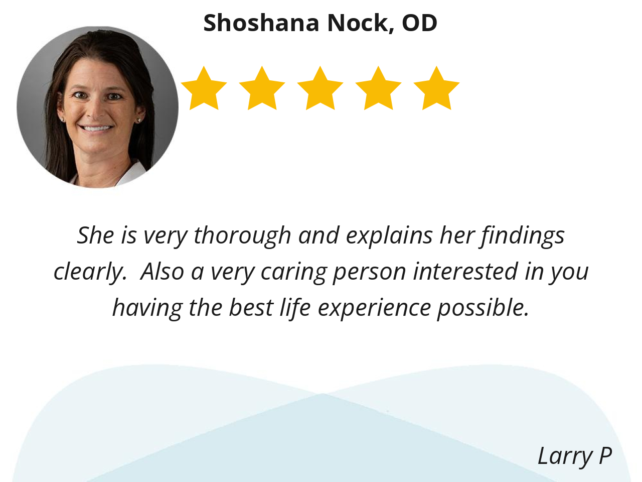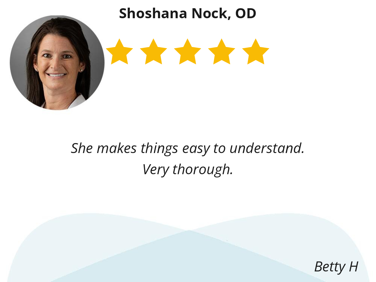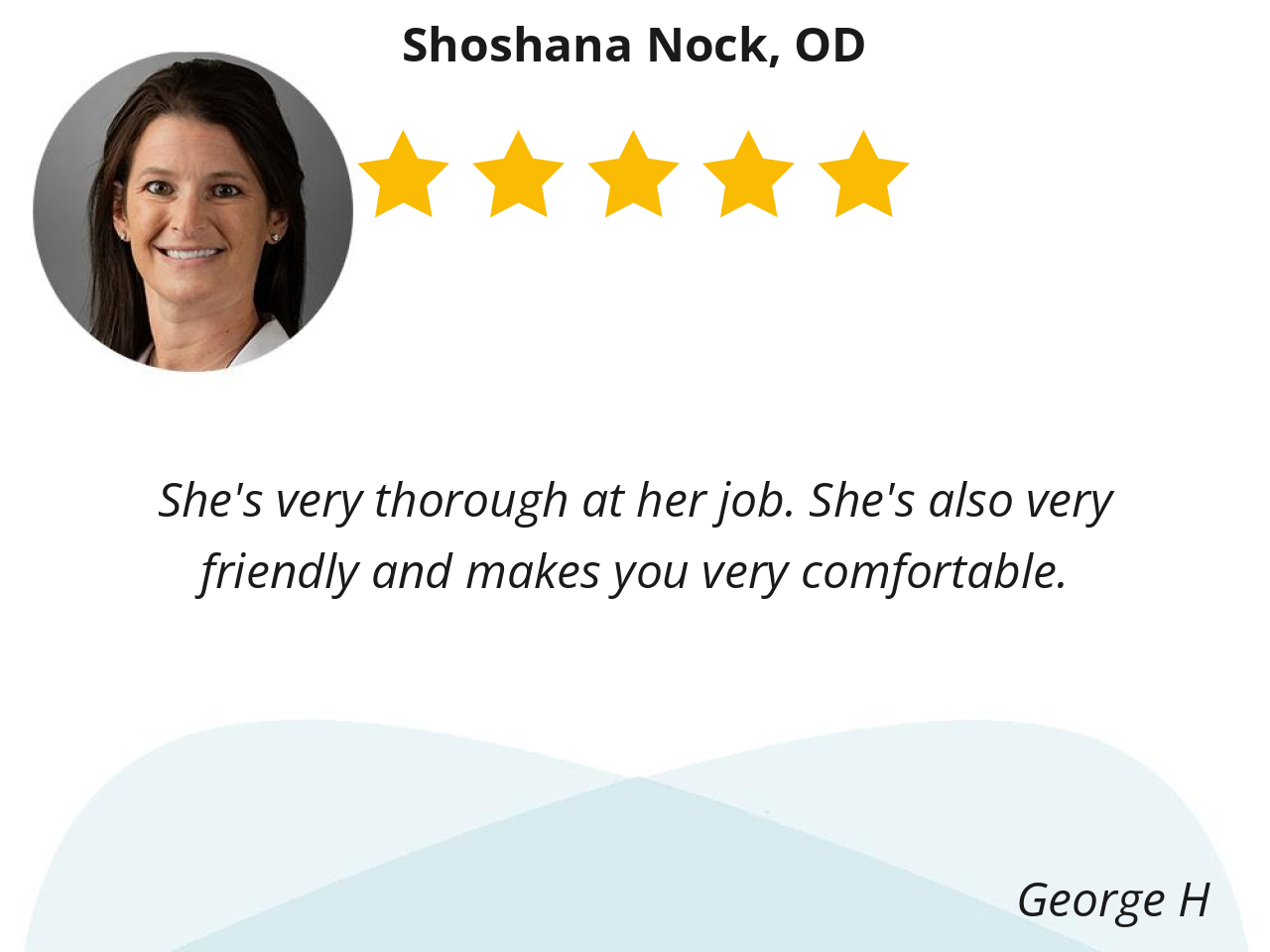 Dr Nock is professional, on time, polite and will gladly answer any questions that I have about my eyes.