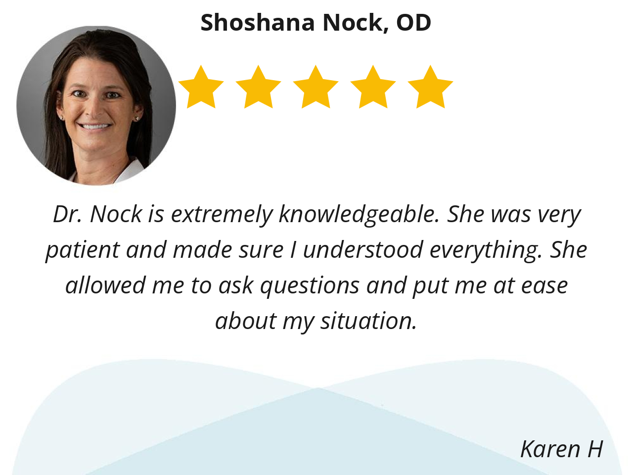 Dr. Nock is extremely knowledgeable. She was very patient and made sure I understood everything. She allowed me to ask questions and put me at ease about my situation.