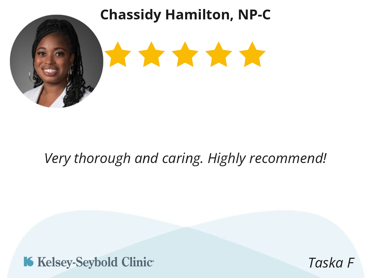 I am deeply grateful to Chassidy Hamilton, NP-C, for her compassion, professionalism, and dedication. She is a wonderful listener who treated my husband with kindness and respect, carefully reviewing every detail to ensure the best possible care. I wholeheartedly recommend her for anyone seeking excellent and compassionate medical treatment.