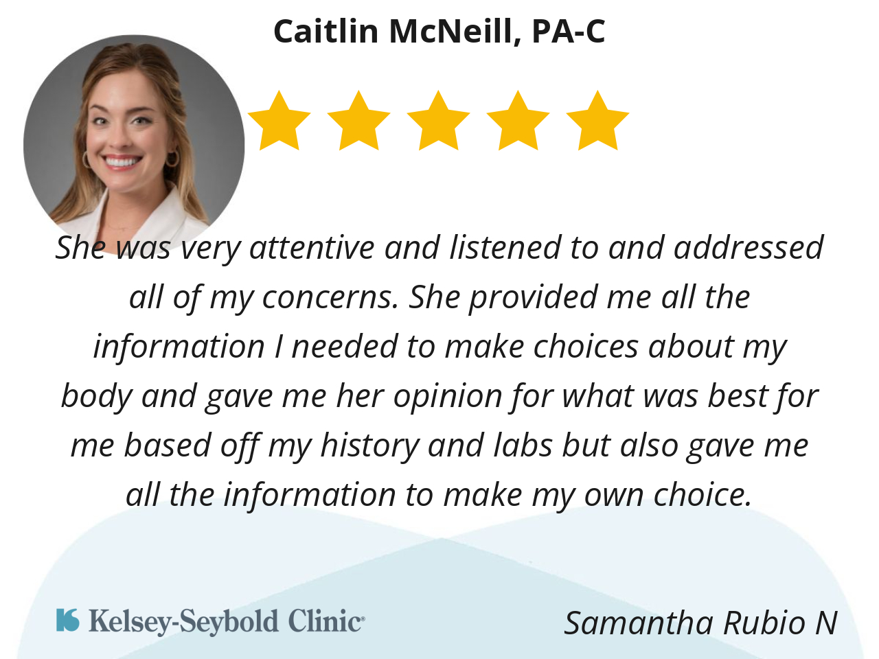 She was very attentive and listened to and addressed all of my concerns. She provided me all the information I needed to make choices about my body and gave me her opinion for what was best for me based off my history and labs but also gave me all the information to make my own choice.
