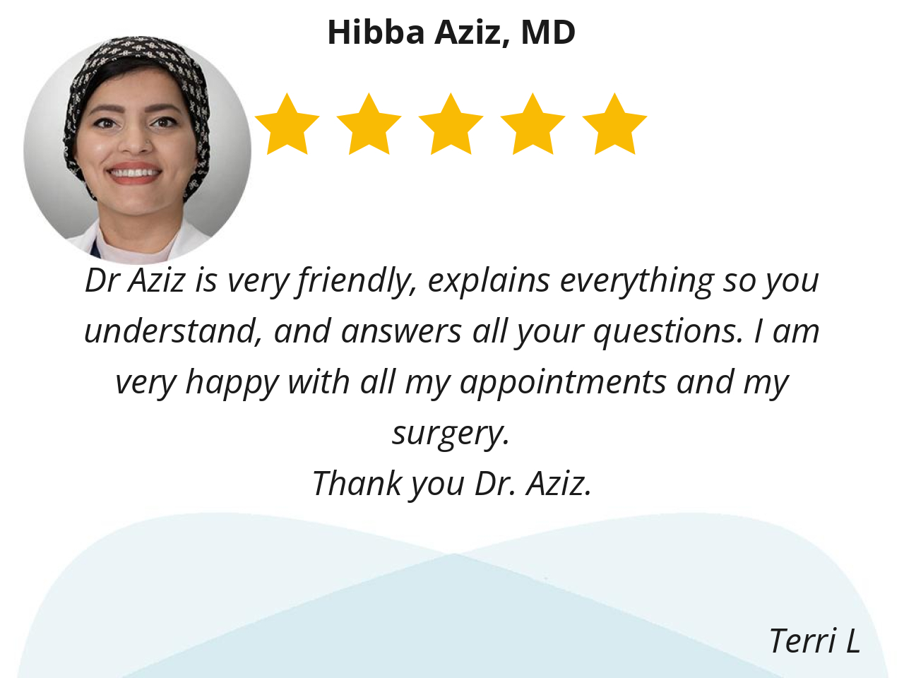 I have been working with Dr.Aziz for 5 months now and 2 surgeries. I have been taking care of the hole time I could not ask for a better support team I am very happy with the care.