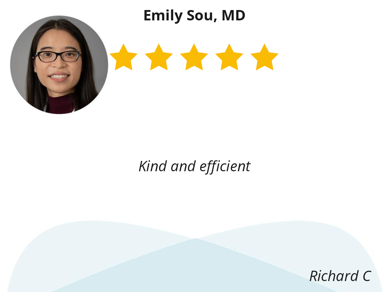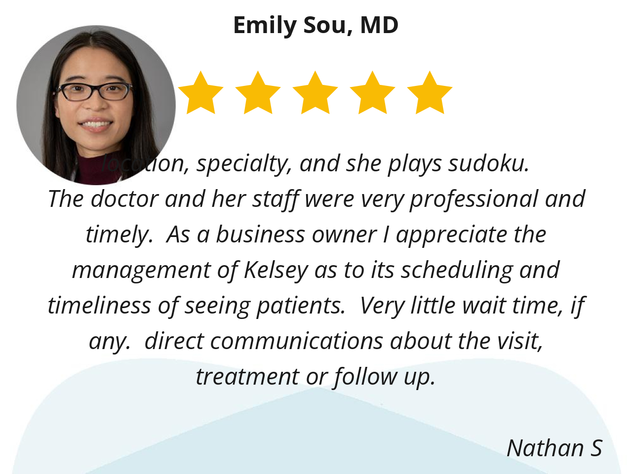 Dr. Emily Sou understand my medical history and she provided me with her personalized evaluation and prescribed a treatment plan to help me maintain good health and peace of mind.