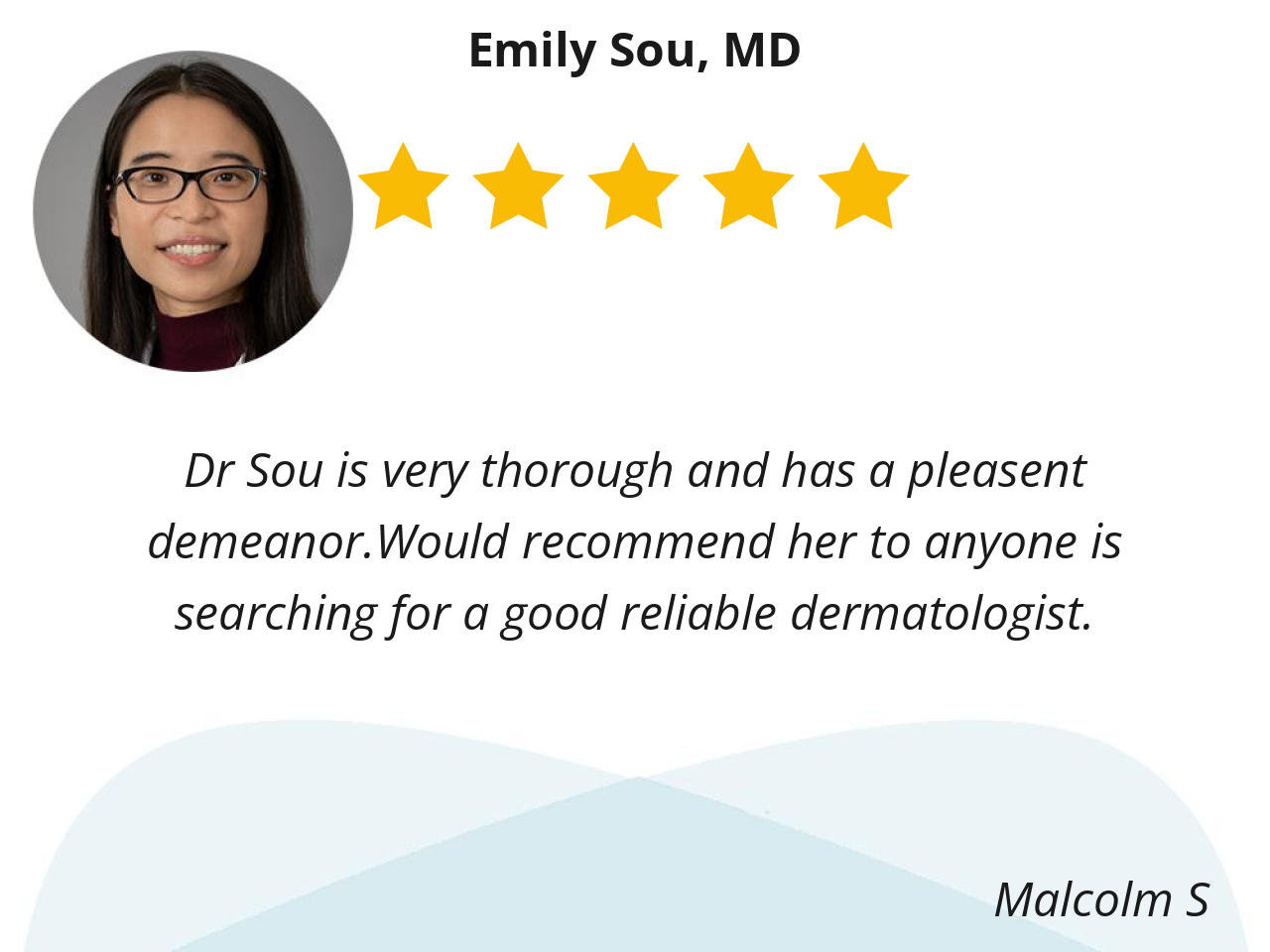Dr Sou is very thorough and has a pleasent demeanor.Would recommend her to anyone is searching for a good reliable dermatologist.