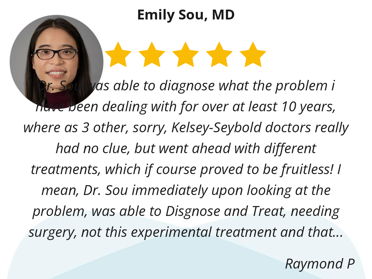 Dr. Sou was able to diagnose what the problem i have been dealing with for over at least 10 years, where as 3 other, sorry, Kelsey-Seybold doctors really had no clue, but went ahead with different treatments, which if course proved to be fruitless! I mean, Dr. Sou immediately upon looking at the problem, was able to Disgnose and Treat, needing surgery, not this experimental treatment and that experimental treatment, that giving me agony.