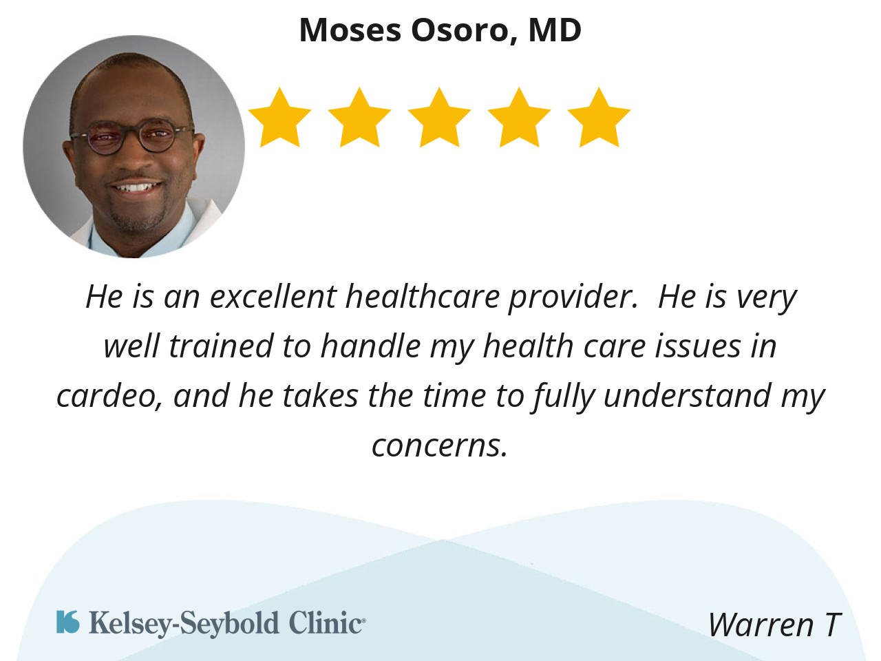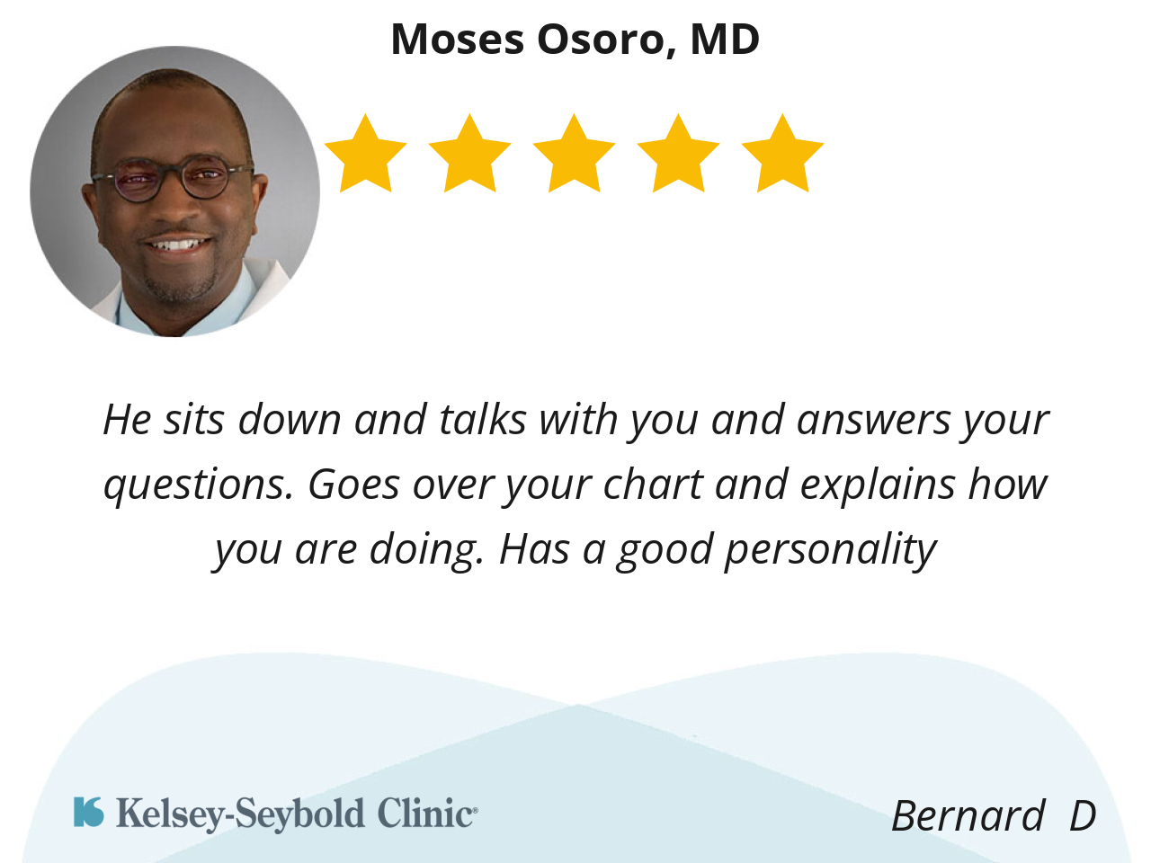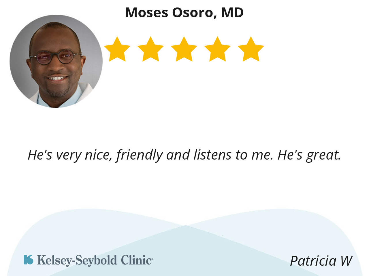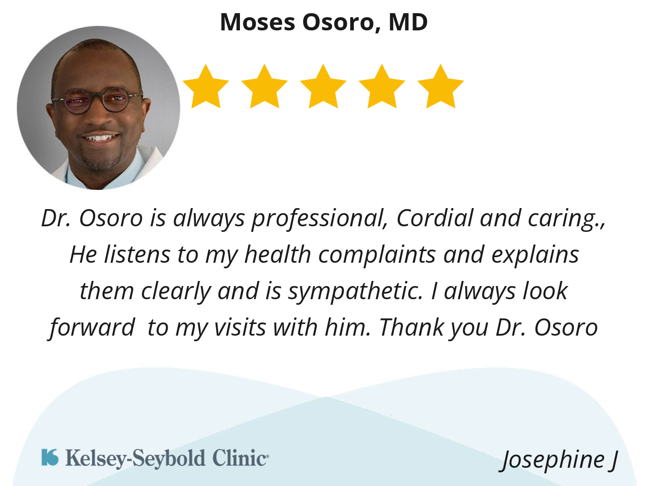 Dr. Osoro is always professional, Cordial and caring., He listens to my health complaints and explains them clearly and is sympathetic. I always look forward to my visits with him. Thank you Dr. Osoro