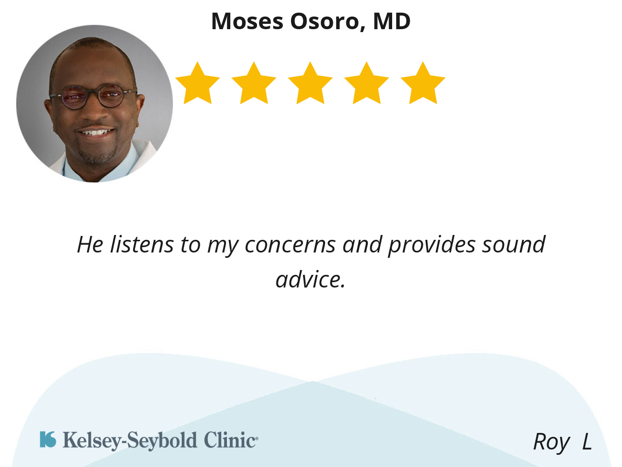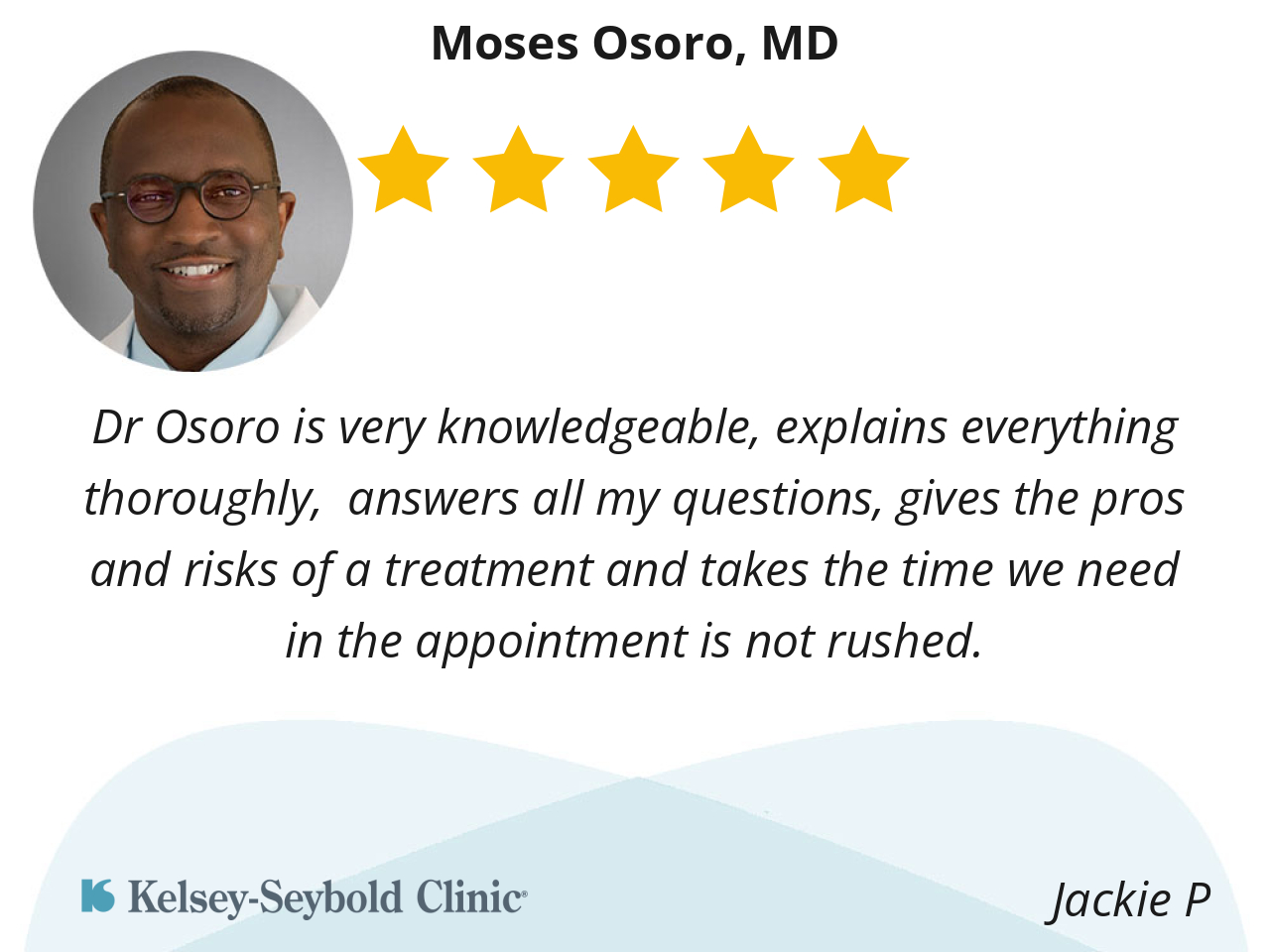 He is very thorough and never rushes your appointment. He cares about my health and covers all concerns I brought up. He is a real asset to kelsey