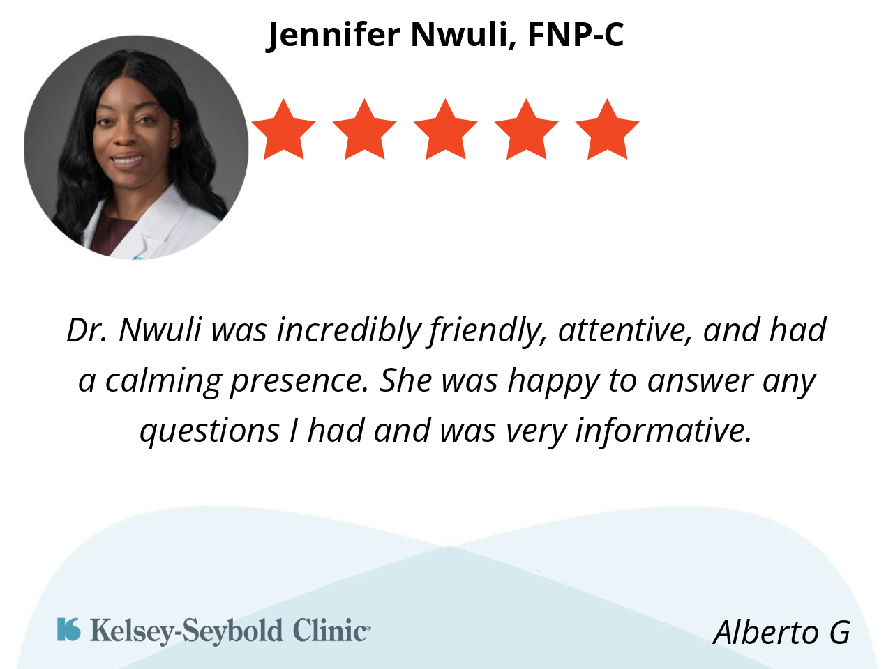 Dr. Nwuli was incredibly friendly, attentive, and had a calming presence. She was happy to answer any questions I had and was very informative.