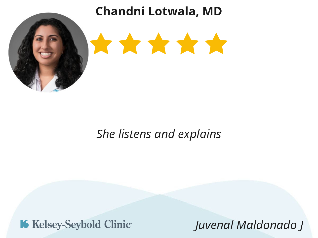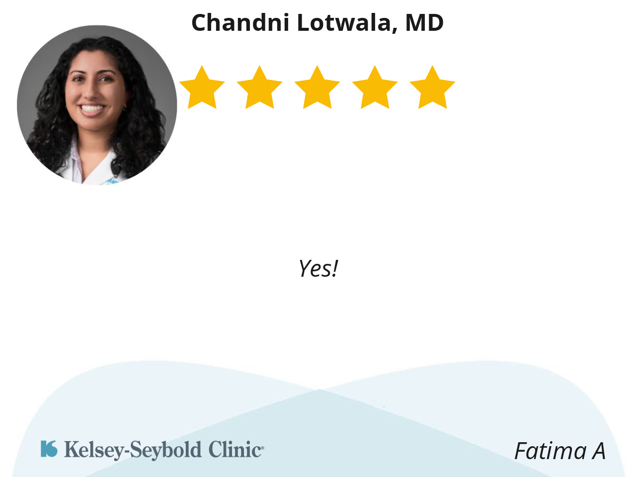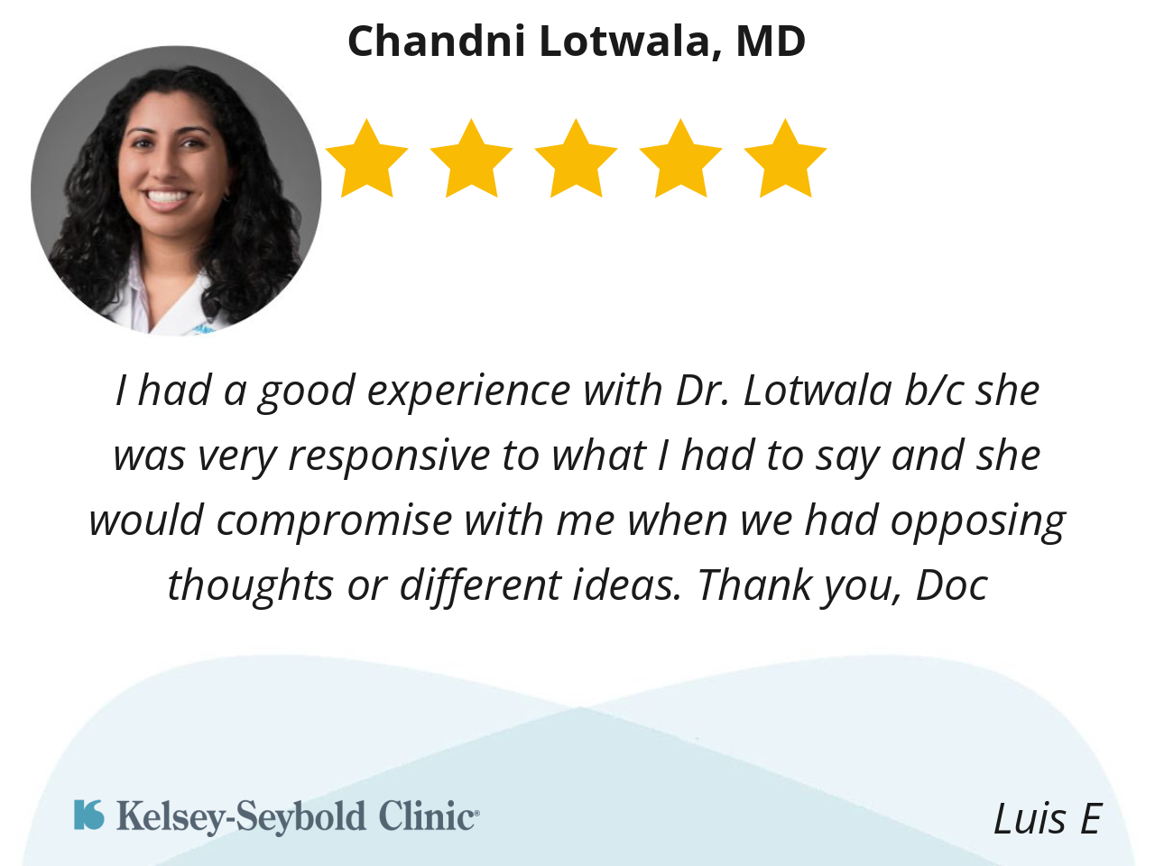 I had a good experience with Dr. Lotwala b/c she was very responsive to what I had to say and she would compromise with me when we had opposing thoughts or different ideas. Thank you, Doc