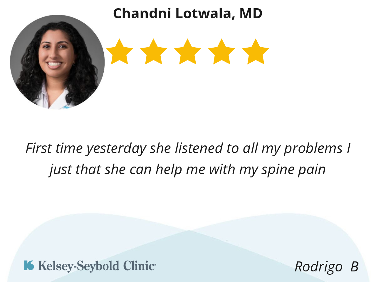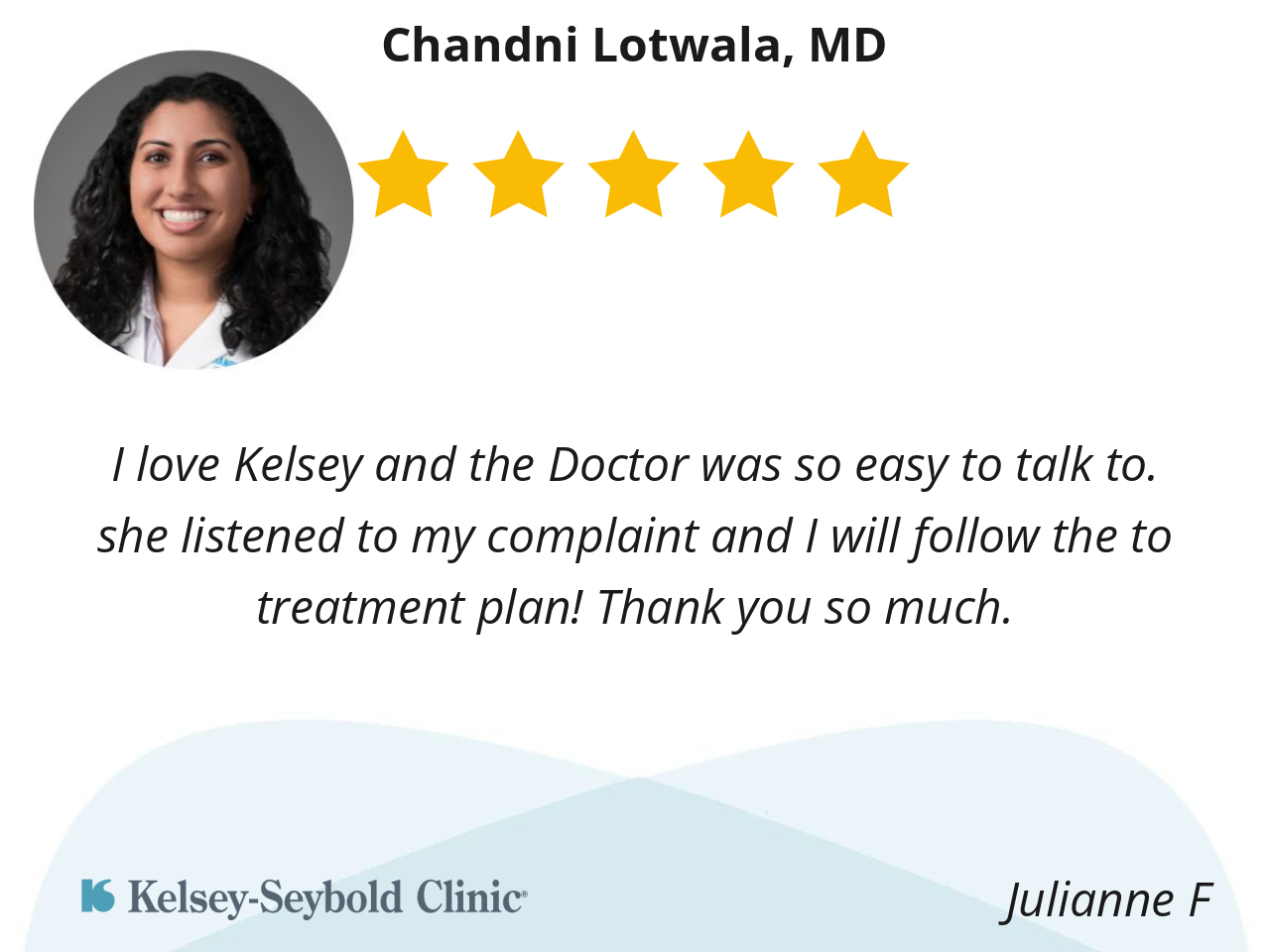 I love Kelsey and the Doctor was so easy to talk to. she listened to my complaint and I will follow the to treatment plan! Thank you so much.