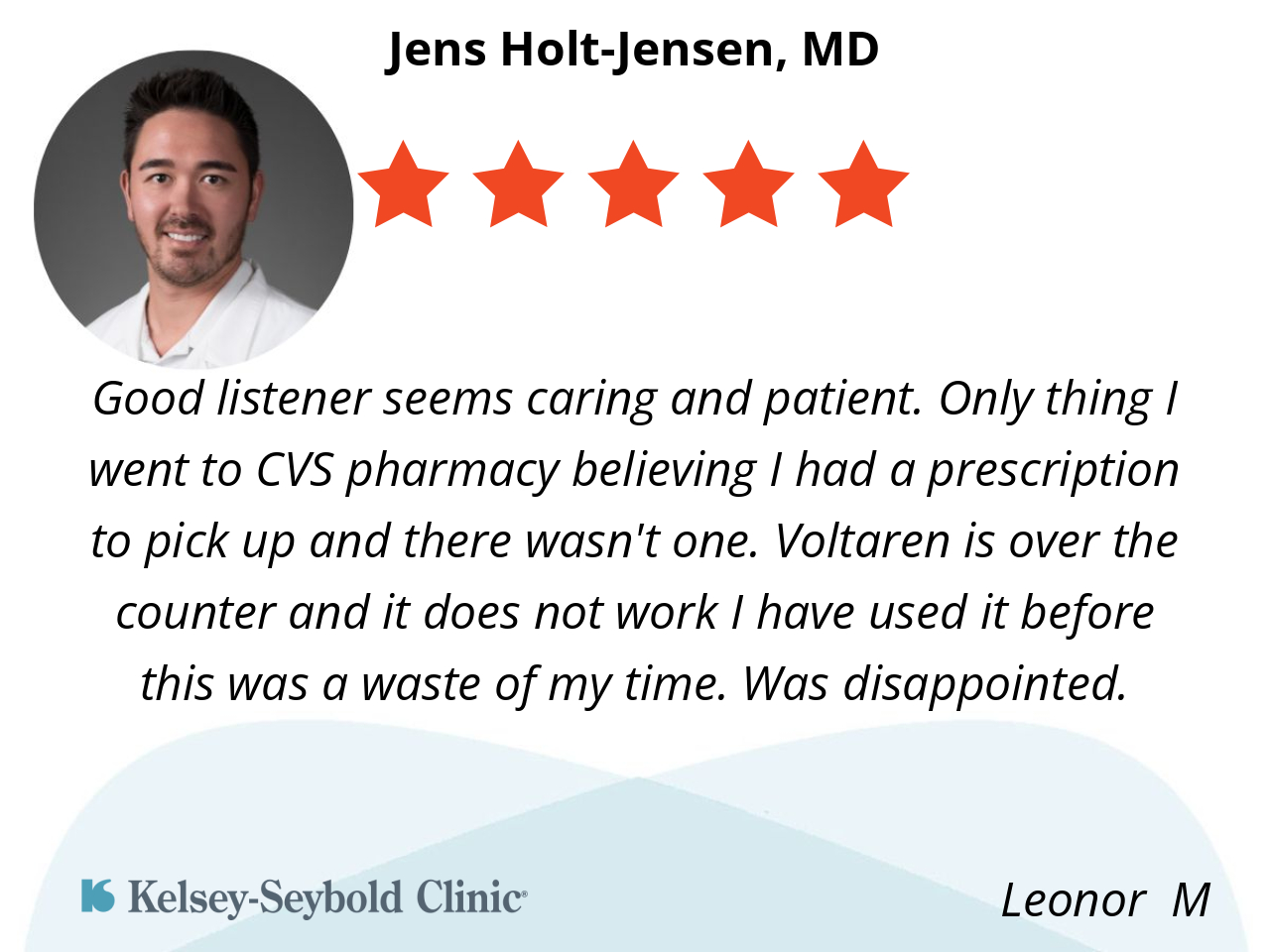 Dr. Jensen seems to be a good doctor for one thing he listens to the patient needs and concerns. Very easy to talk to.