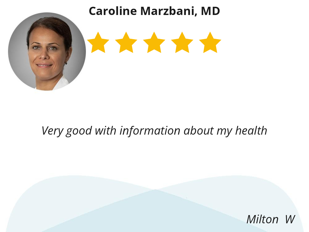 Dr. Marzbani is a wonderful and caring physician and is very thorough in her care for me. In addition, her personality is very pleasing which makes my office visits pleasant.