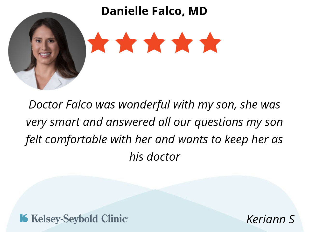 Doctor Falco was wonderful with my son, she was very smart and answered all our questions my son felt comfortable with her and wants to keep her as his doctor
