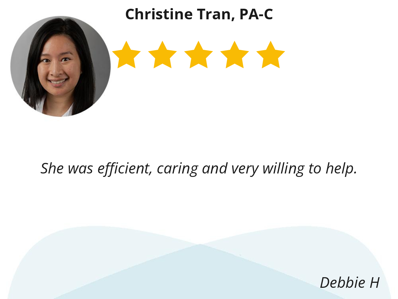Christine Tran doesn't ever make you feel rushed. She listens to all of your symptoms and truly tries to help you figure out the cause.