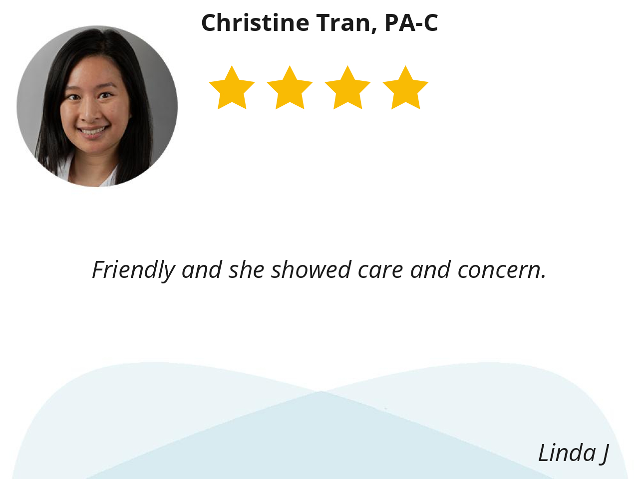 Dr. Tran is very thorough with her examinations, listens to your concerns and takes time to give you explanations of your concerns. Her staff is also very nice and accommodating, and makes sure that you are comfortable during the whole process.