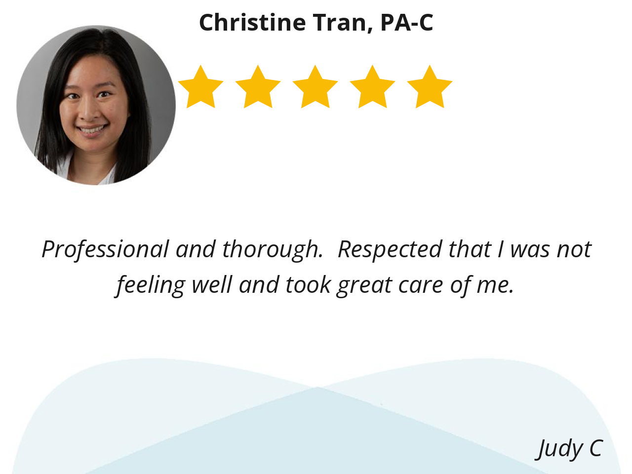 Professional and thorough. Respected that I was not feeling well and took great care of me.