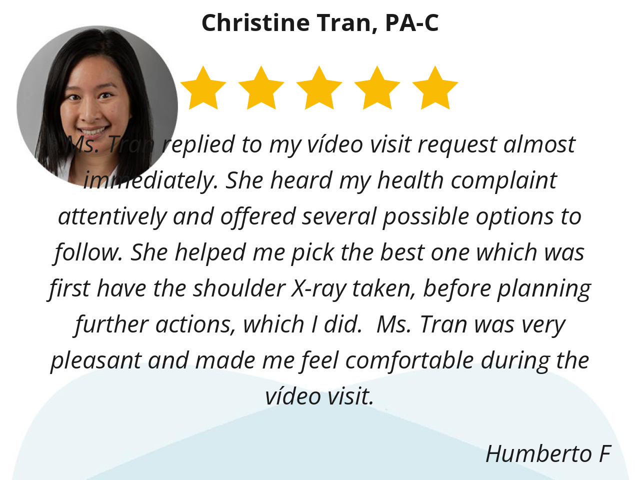 Ms. Tran replied to my vídeo visit request almost immediately. She heard my health complaint attentively and offered several possible options to follow. She helped me pick the best one which was first have the shoulder X-ray taken, before planning further actions, which I did. Ms. Tran was very pleasant and made me feel comfortable during the vídeo visit.