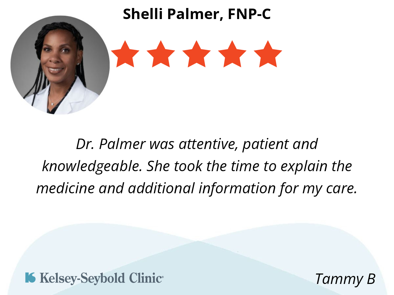Dr. Palmer was attentive, patient and knowledgeable. She took the time to explain the medicine and additional information for my care.
