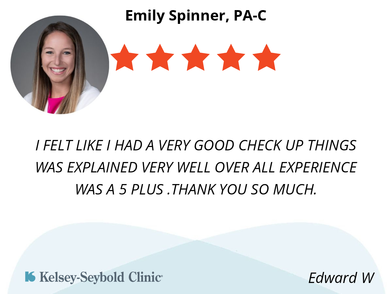 I FELT LIKE I HAD A VERY GOOD CHECK UP THINGS WAS EXPLAINED VERY WELL OVER ALL EXPERIENCE WAS A 5 PLUS .THANK YOU SO MUCH.