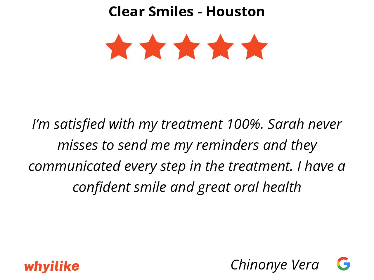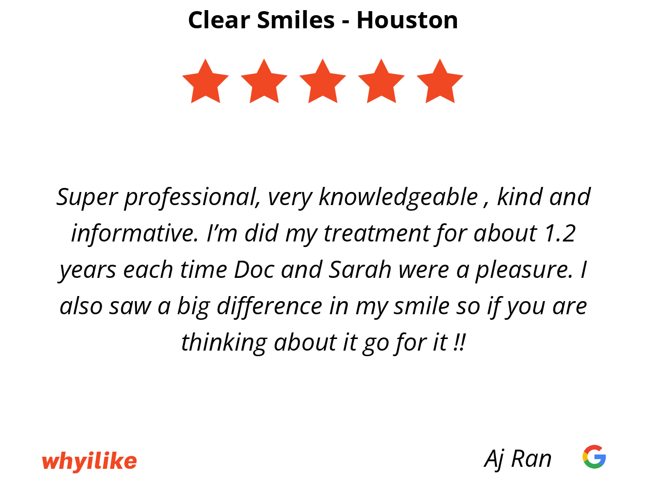 Had a really good Invisalign experience here at the Clear Smiles houston location with Sarah and Dr. Abraham. Smooth process from start to finish and they worked with me to ensure I was very happy with my smile at the end of the treatment. Highly recommend coming here for your Invisalign - they are excellent providers and the price is unbeatable.