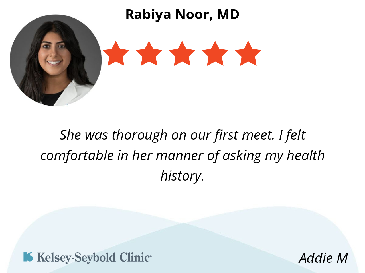 She was thorough on our first meet. I felt comfortable in her manner of asking my health history.