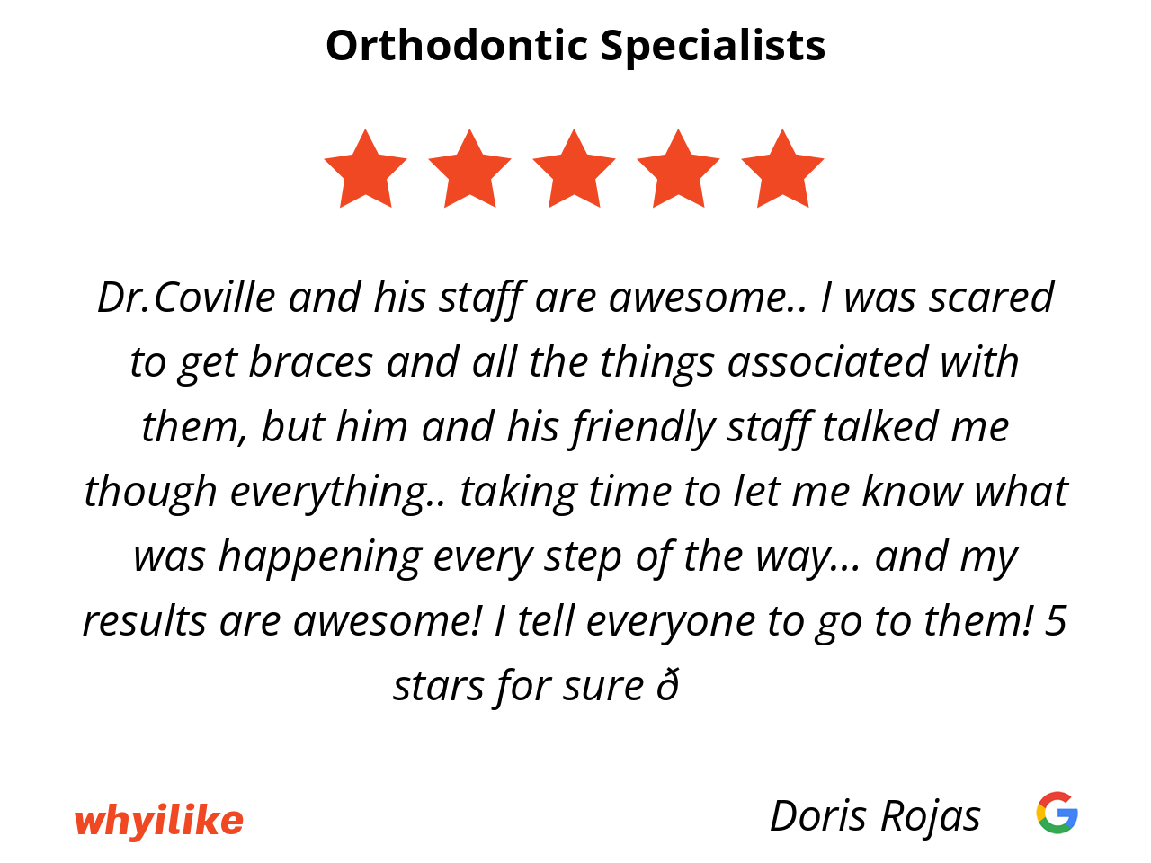 Dr.Coville and his staff are awesome.. I was scared to get braces and all the things associated with them, but him and his friendly staff talked me though everything.. taking time to let me know what was happening every step of the way… and my results are awesome! I tell everyone to go to them! 5 stars for sure 😊