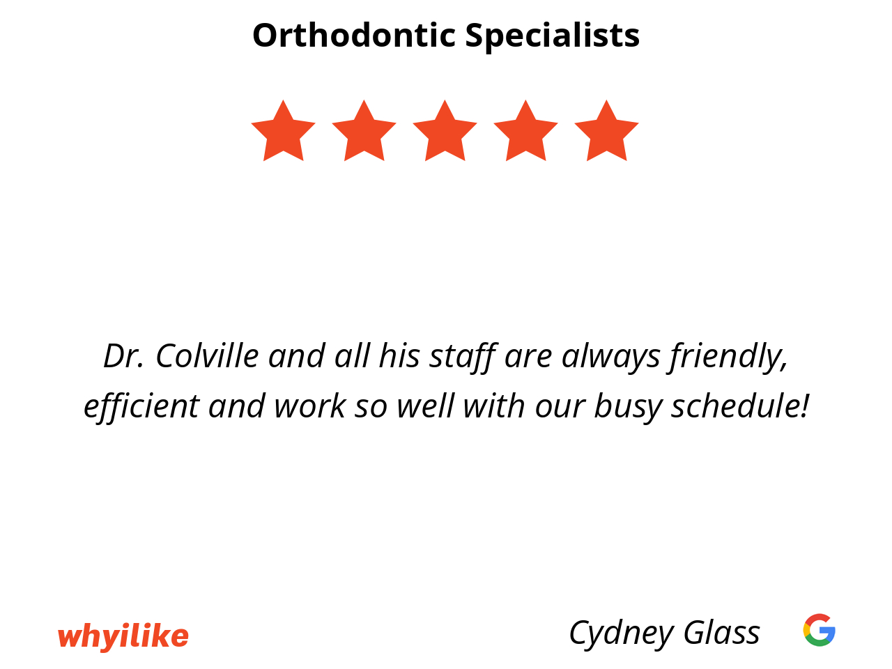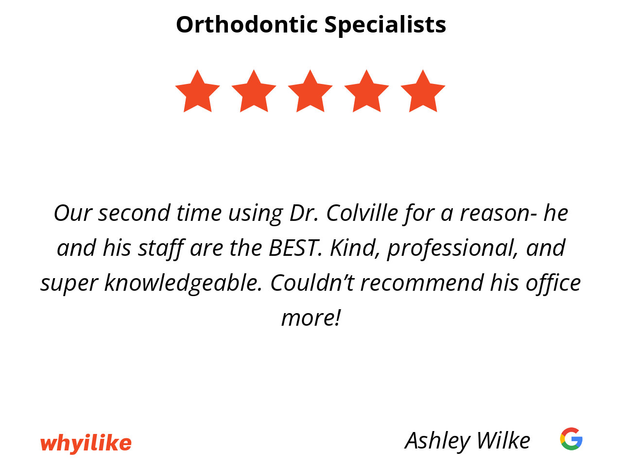 Thanks to Dr. Colville and his team, my 3 boys have straight teeth and great smiles! My last kid just finished his Invisalign treatment. I highly recommend Orthodontic Specialists - everyone in the office is friendly, helpful, and professional. There are fun contests, ways to earn points and kids get ice cream after their visit. I’ll actually miss going to appointments!