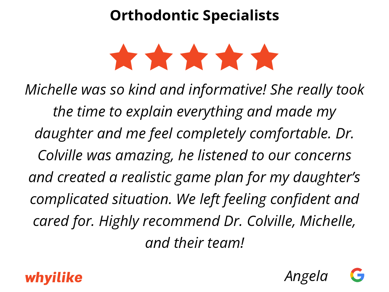 Michelle was so kind and informative! She really took the time to explain everything and made my daughter and me feel completely comfortable. Dr. Colville was amazing, he listened to our concerns and created a realistic game plan for my daughter’s complicated situation. We left feeling confident and cared for. Highly recommend Dr. Colville, Michelle, and their team!