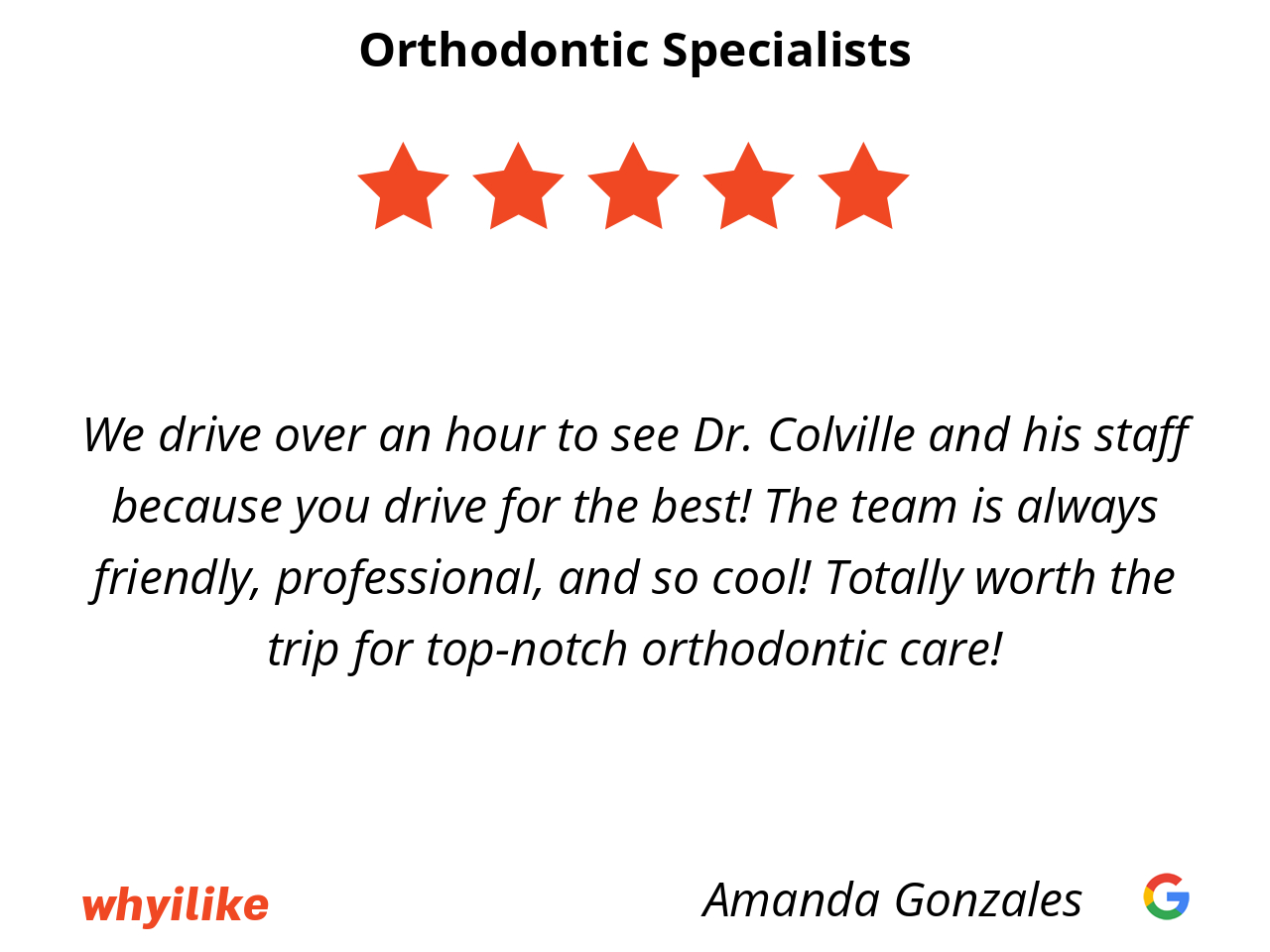 We drive over an hour to see Dr. Colville and his staff because you drive for the best! The team is always friendly, professional, and so cool! Totally worth the trip for top-notch orthodontic care!