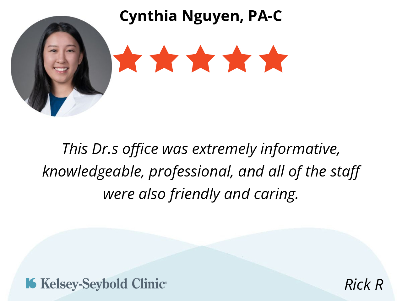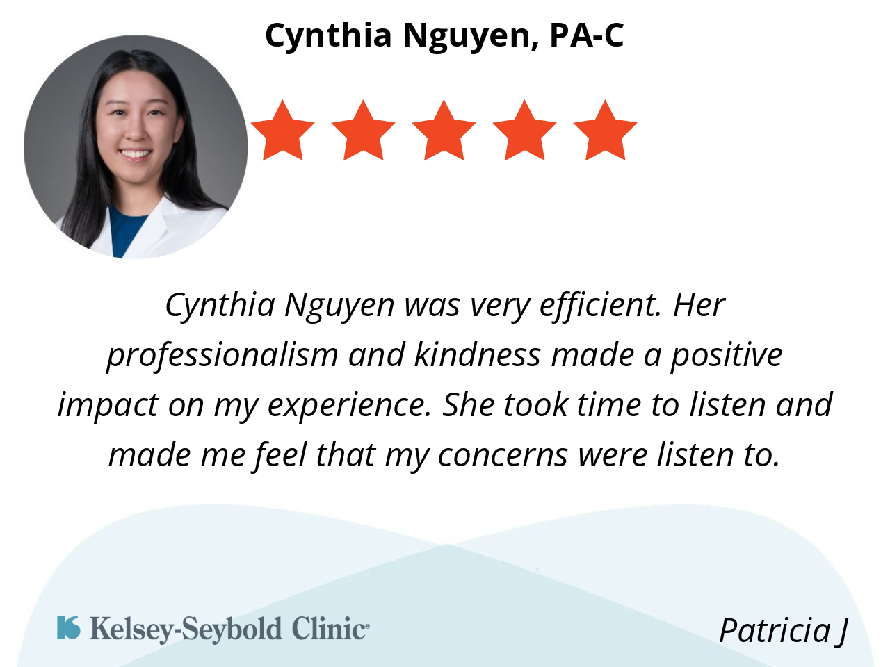 Cynthia is a very pleasant and engaging young professional. She listened to me thoughtfully and explained my medical options patiently and clearly.
