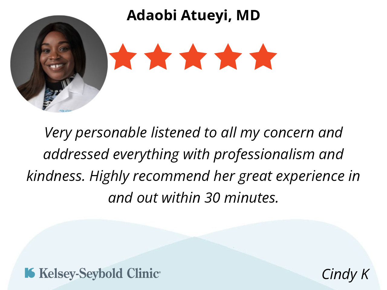 Very personable listened to all my concern and addressed everything with professionalism and kindness. Highly recommend her great experience in and out within 30 minutes.