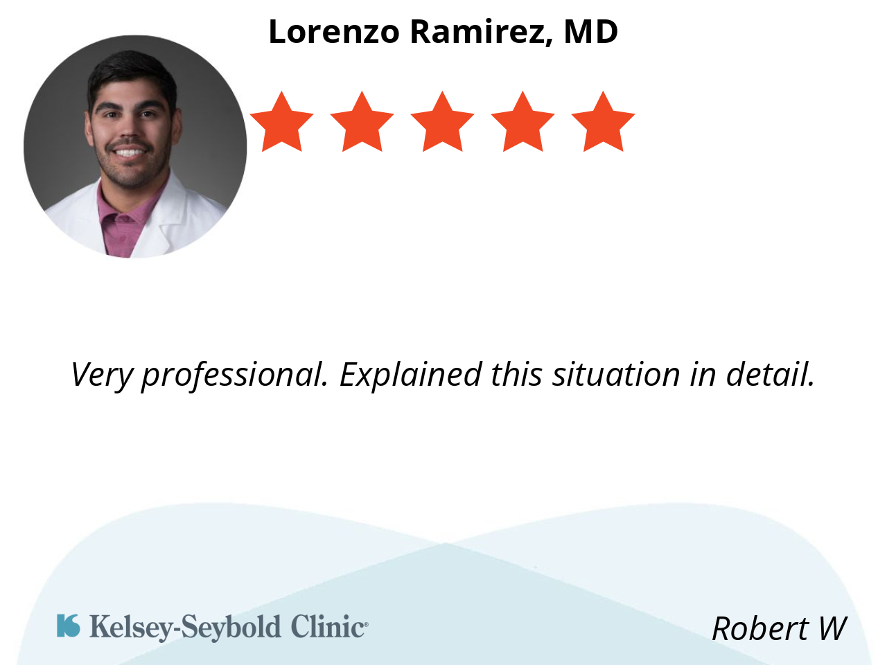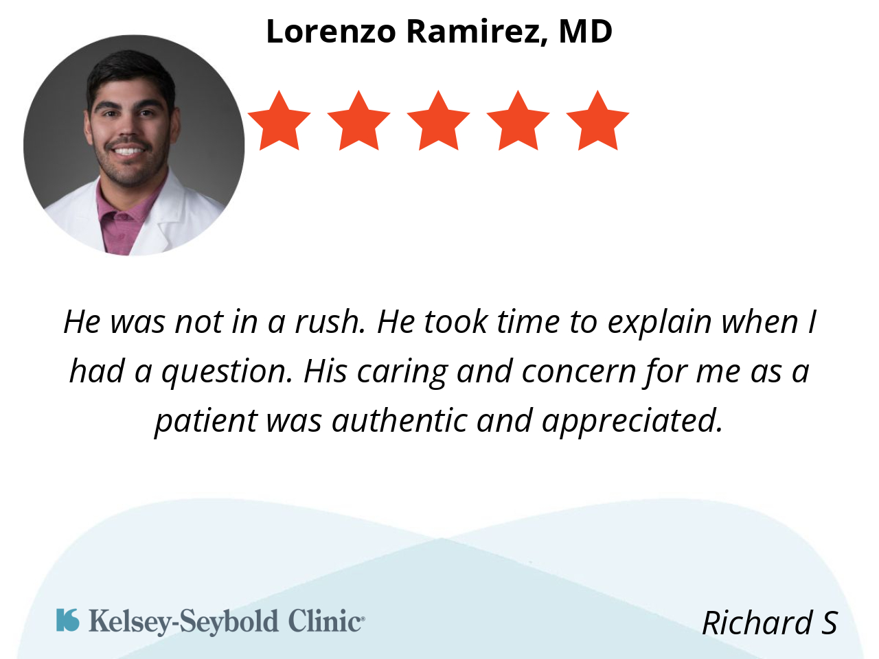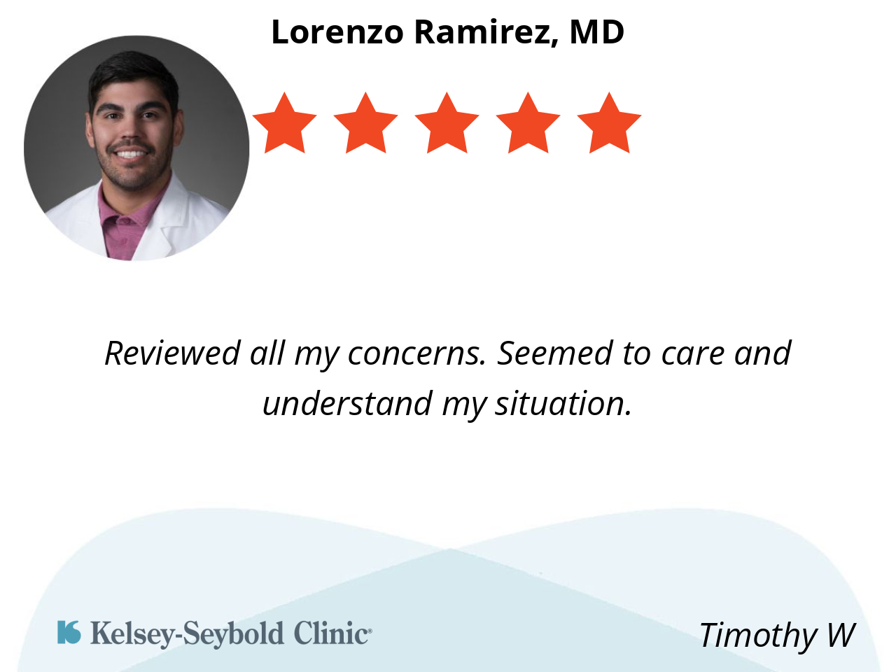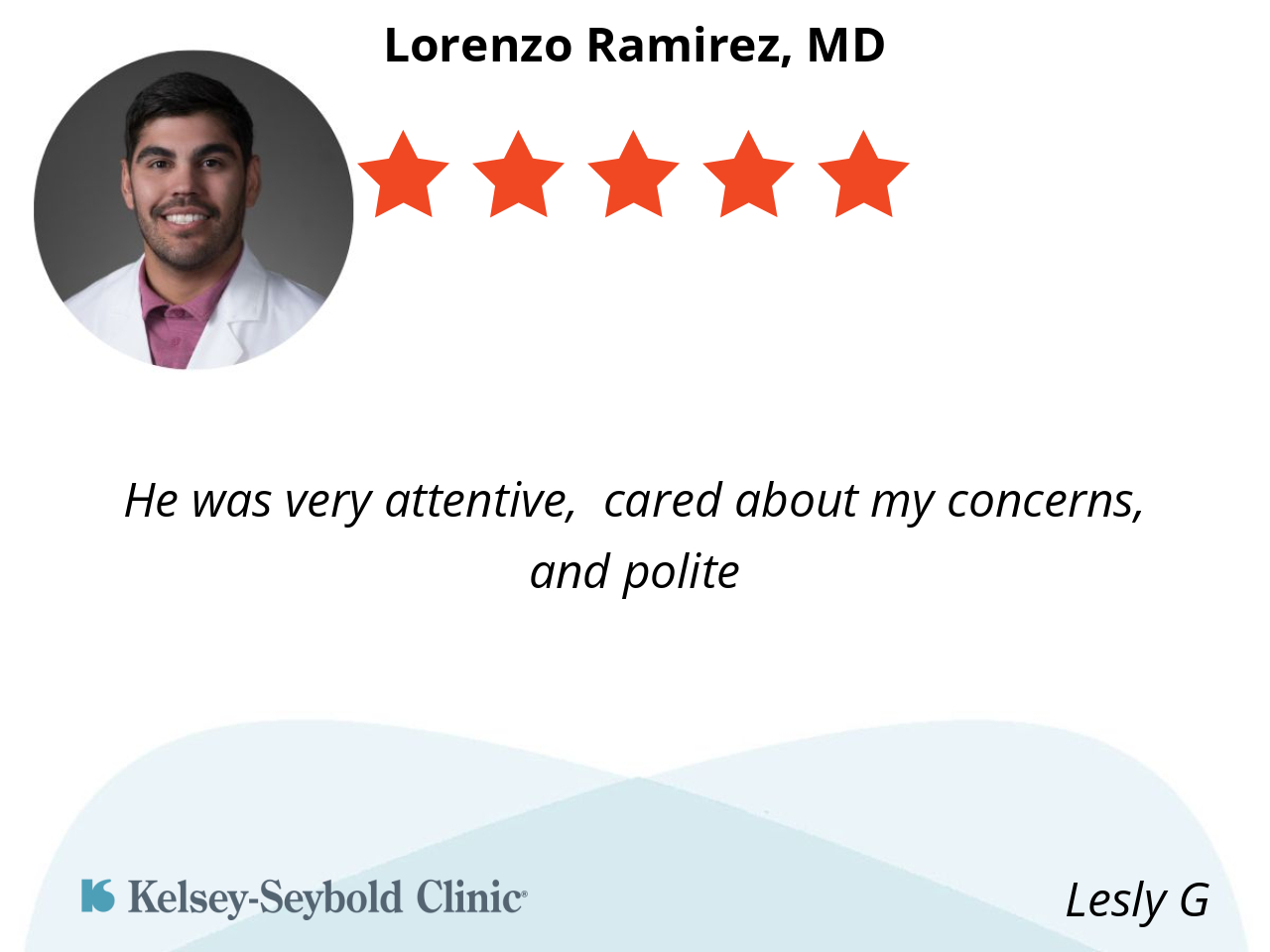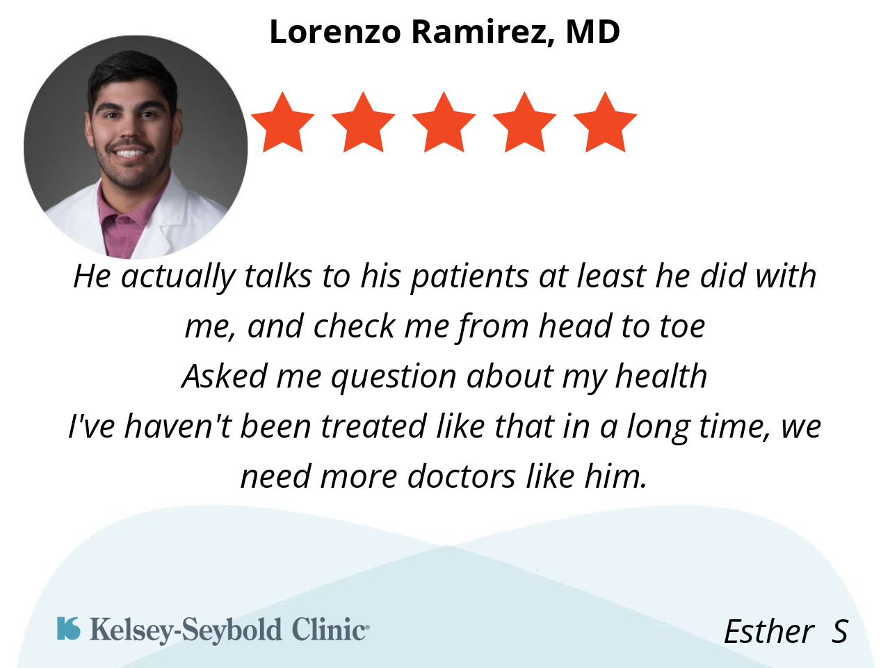 I like Dr. Lorenzo Ramirez because he is friendly, patient, and thorough. He takes his time to make sure all your questions are answered. That way you don’t feel rushed out the door. Dr. Ramirez smiled and was a happy person to be around. He’s also very smart, and knows his profession. I felt like I was in good hands. I left, knowing he would be around to take care of my future needs. He is one of the nicest doctors I’ve met at Kelsey.