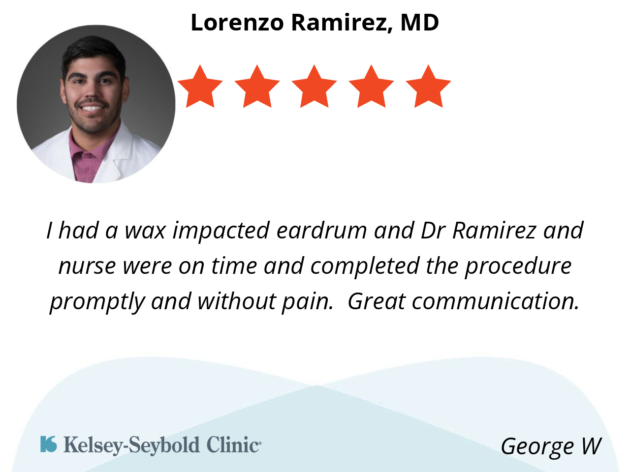 I had a wax impacted eardrum and Dr Ramirez and nurse were on time and completed the procedure promptly and without pain. Great communication.