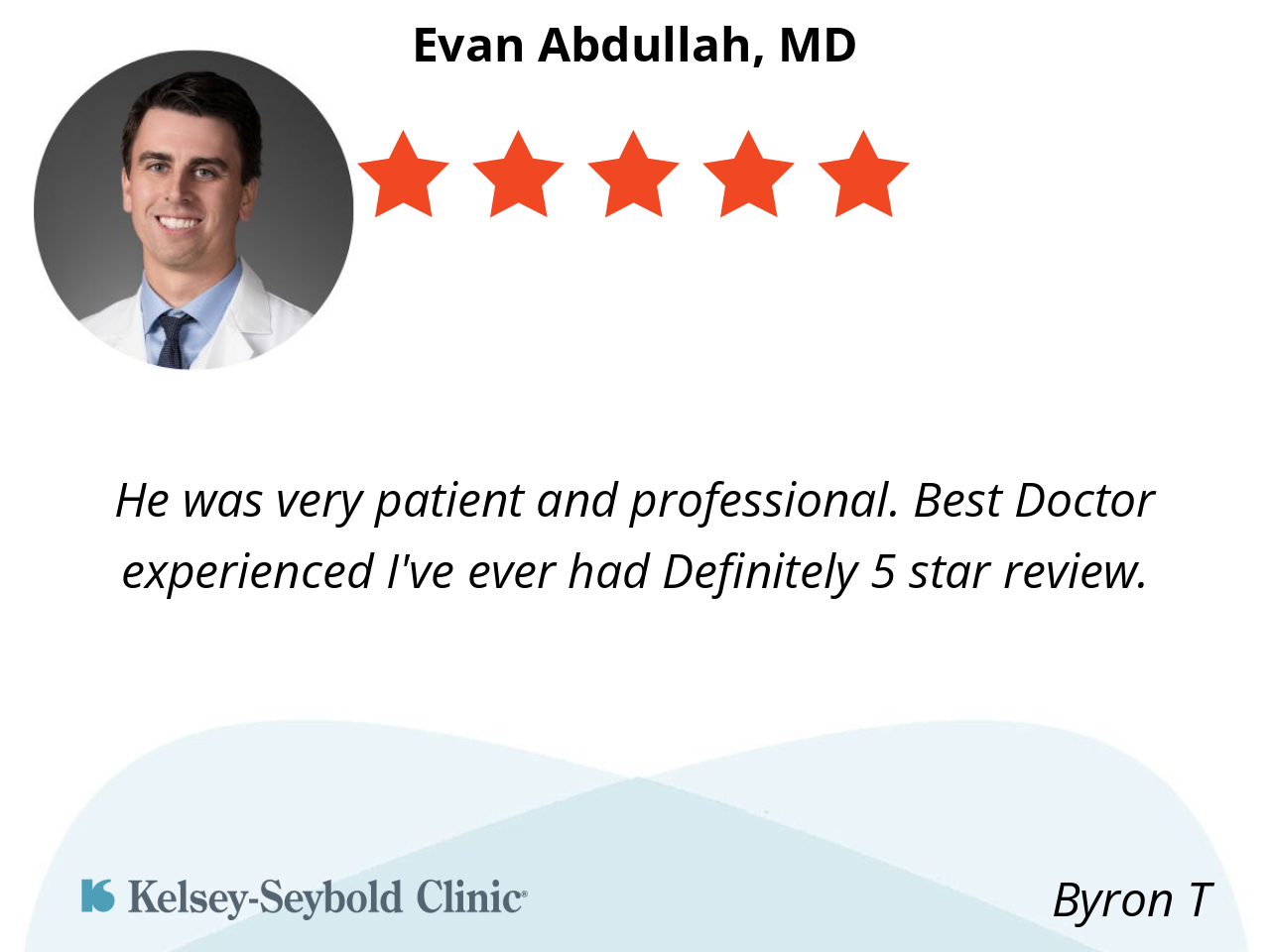 Out of the blue, I became aware of my blood pressure issue. I did not have a doctor so Dr. Abdullah was assigned to me. He has been a life changer! Friendly, caring, competent, interested, informative- he has been everything you could want in a physician! I am so appreciative to both Dr. Abdullah and Kelsey-Seybold!