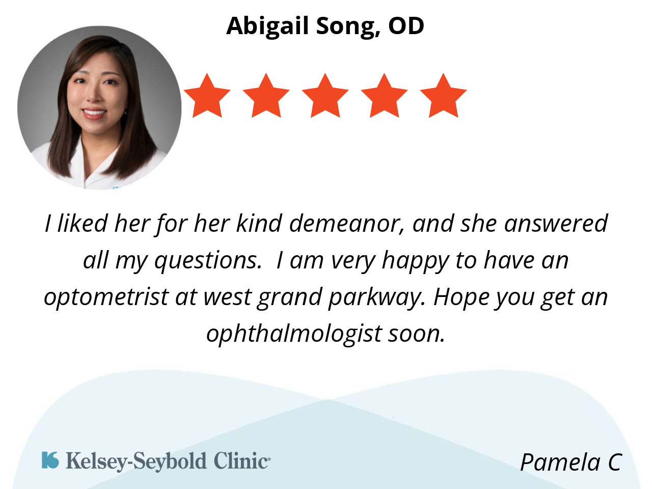 I liked her for her kind demeanor, and she answered all my questions. I am very happy to have an optometrist at west grand parkway. Hope you get an ophthalmologist soon.