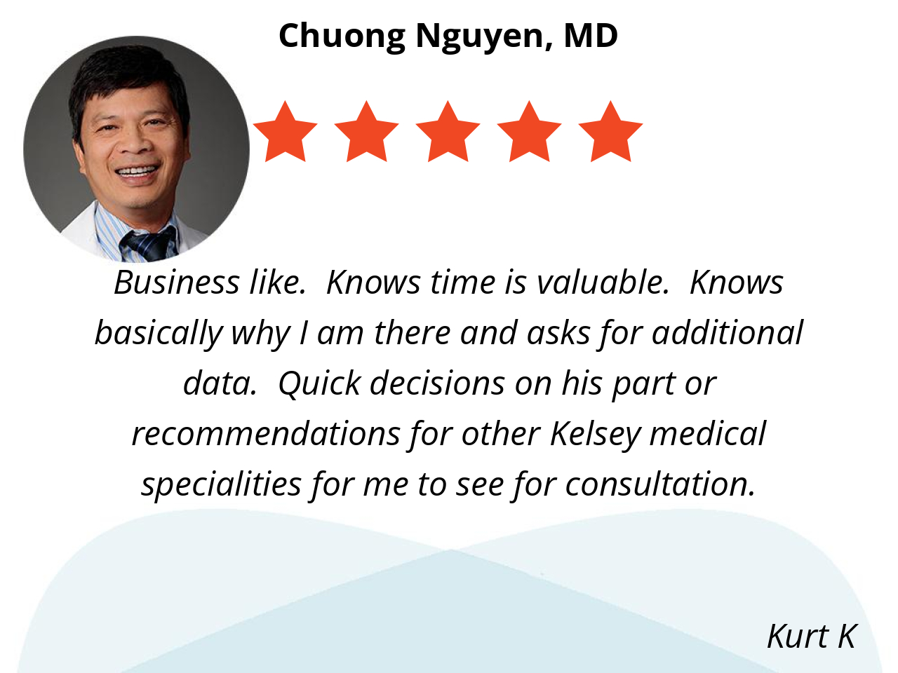 Business like. Knows time is valuable. Knows basically why I am there and asks for additional data. Quick decisions on his part or recommendations for other Kelsey medical specialities for me to see for consultation.