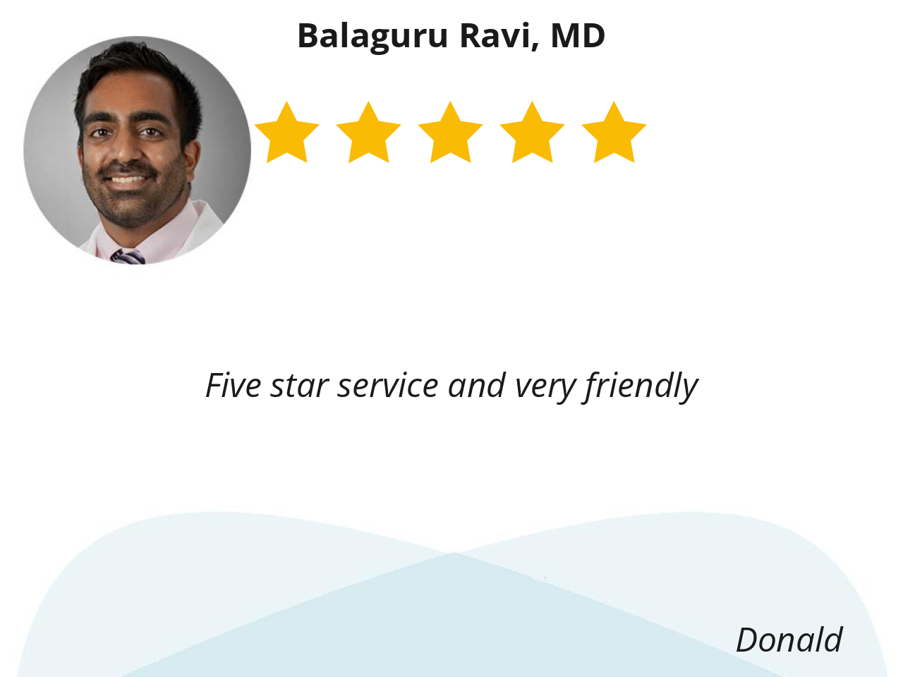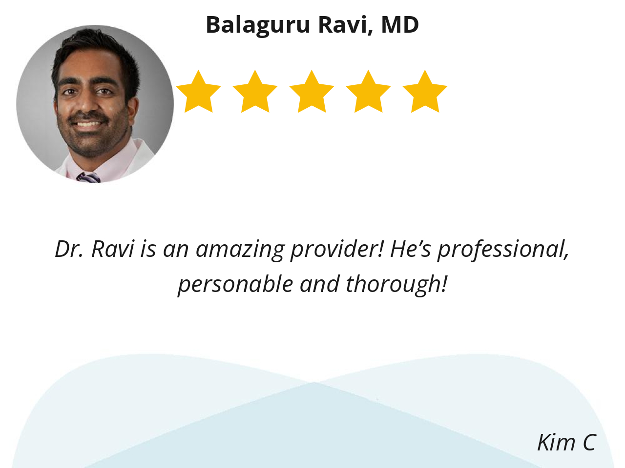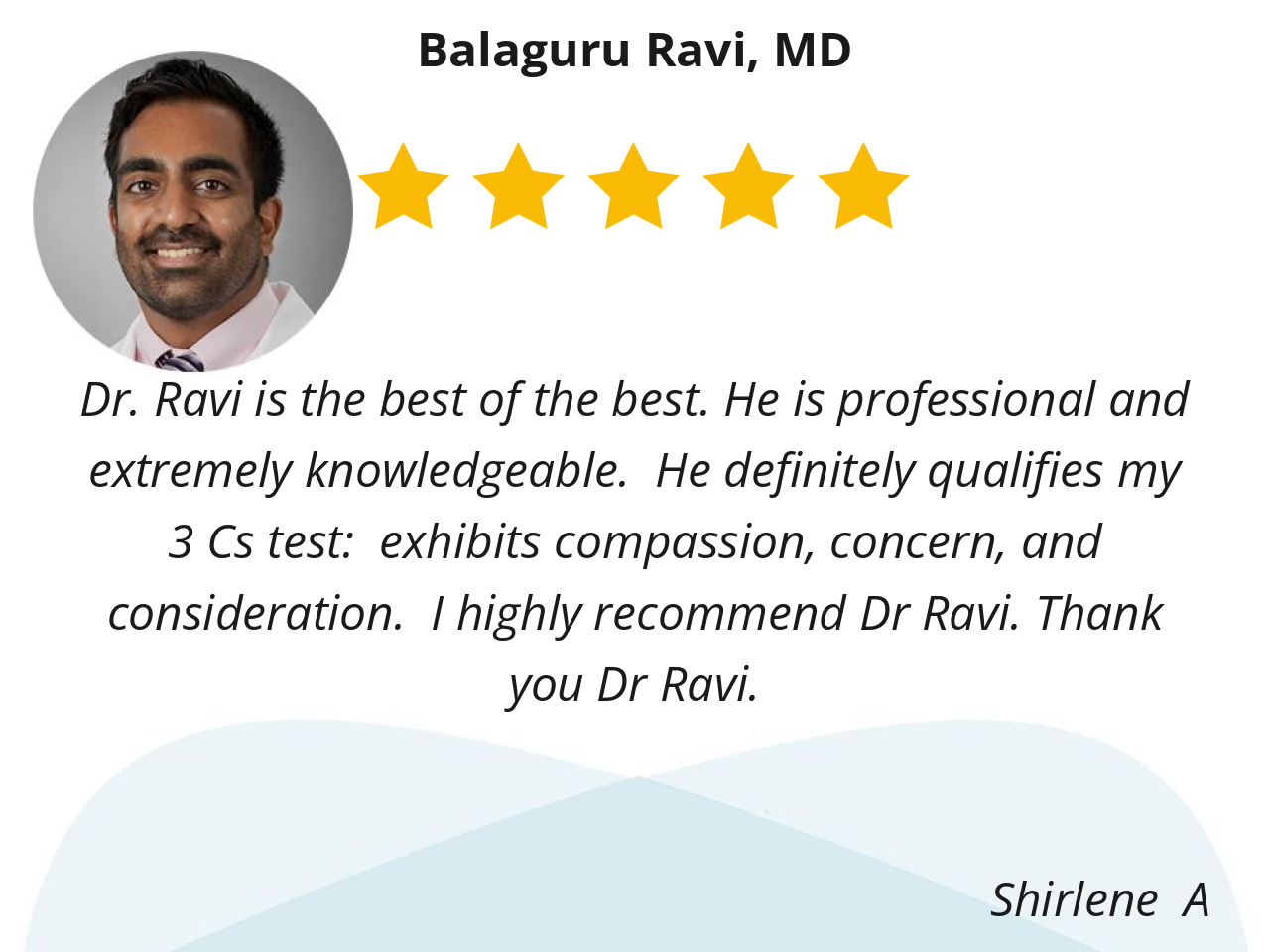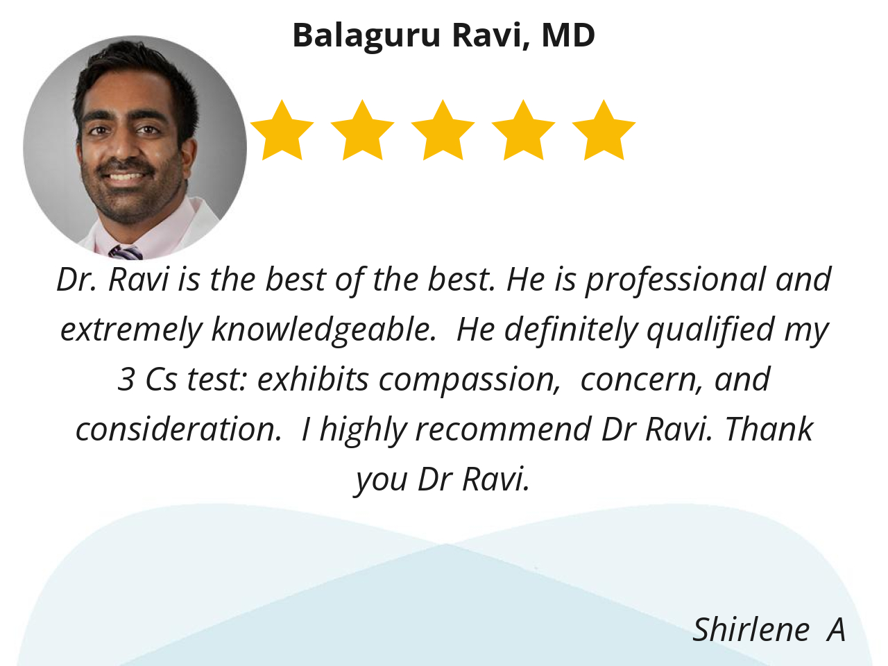 Dr. Ravi is the best of the best. He is professional and extremely knowledgeable. He definitely qualifies my 3 Cs test: exhibits compassion, concern, and consideration. I highly recommend Dr Ravi. Thank you Dr Ravi.