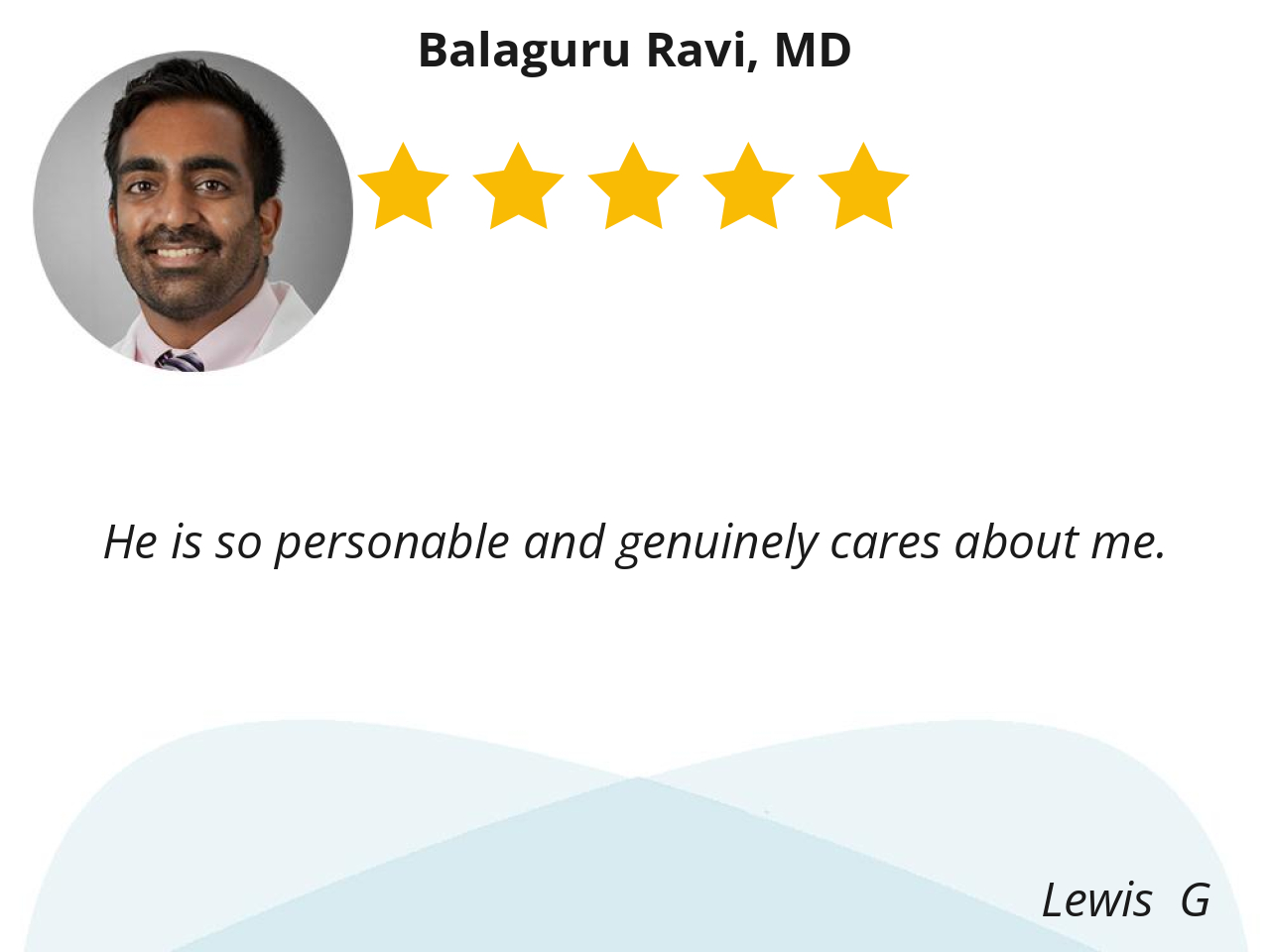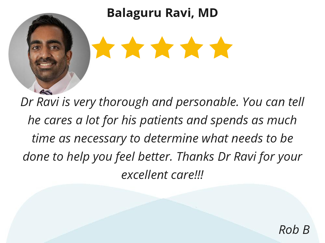 Dr Ravi is very thorough and personable. You can tell he cares a lot for his patients and spends as much time as necessary to determine what needs to be done to help you feel better. Thanks Dr Ravi for your excellent care!!!