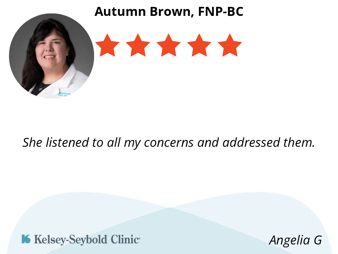 I was glad to be introduced to Autumn Brown for a follow up to my ER visit. She was very professional and listened to my concerns which were complicated. She suggested and ordered a test which was very helpful to the diagnosis of my condition and also suggested a natural solution to help with my sleeplessness. I will definitely book an appointment with her again if it is appropriate to my needs.
