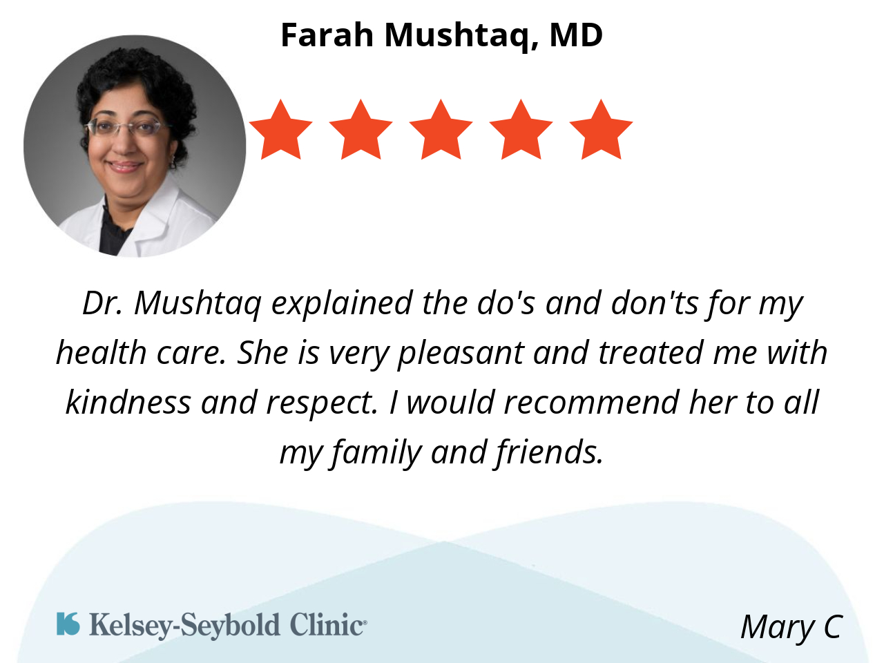 Dr. Mushtaq explained the do's and don'ts for my health care. She is very pleasant and treated me with kindness and respect. I would recommend her to all my family and friends.